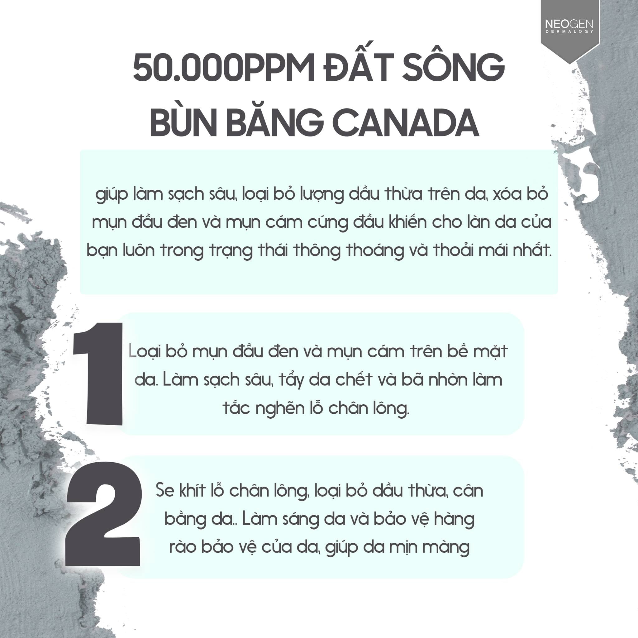 - Chứa 50.000ppm đất sông bùn băng Canada và đất sét, giúp làm sạch sâu, loại bỏ lượng dầu thừa trên da, xóa bỏ mụn đầu đen và mụn cám cứng đầu khiến cho làn da của bạn luôn trong trạng thái thông thoáng và thoải mái nhất.