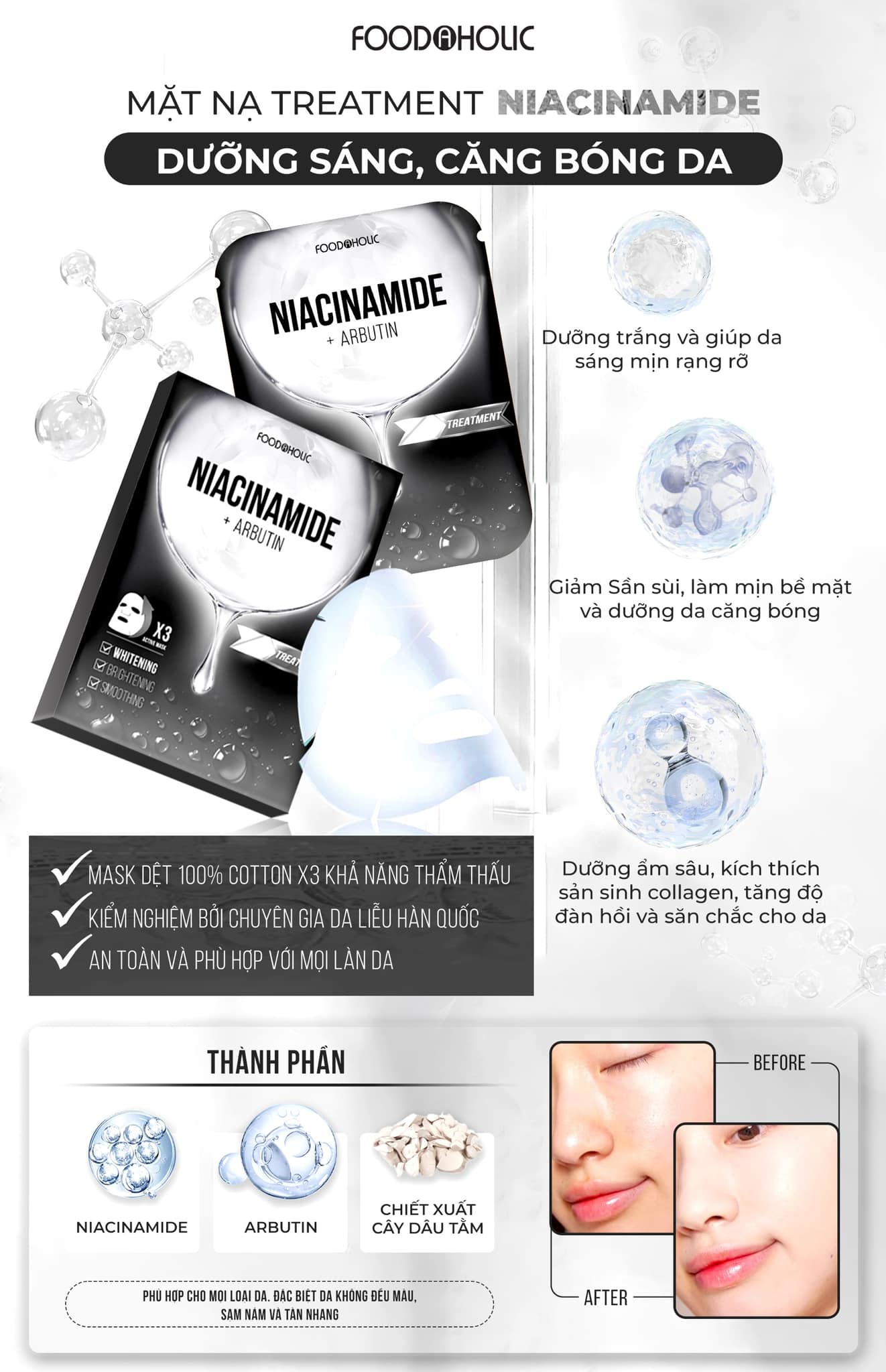 - Mặt nạ có thành phần chính là Niacinamide, Arbutin, Chiết xuất cây dâu tằm …. dòng mặt nạ Treatment là phương pháp làm đẹp tối ưu giúp dưỡng trắng, căng bóng da với công thức an toàn nghiên cứu bởi chuyên gia da liễu Hàn Quốc an toàn cho mọi làn da.