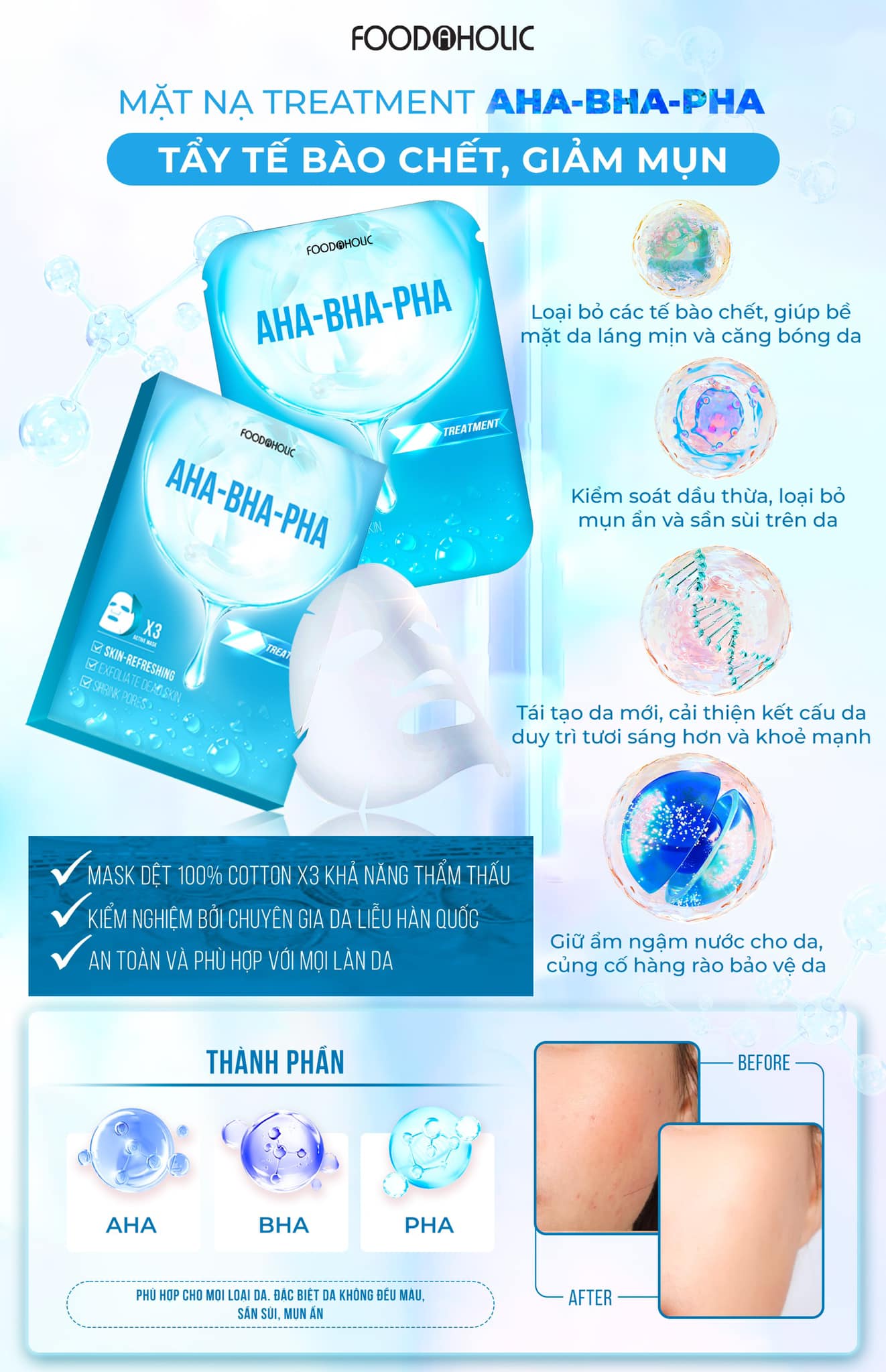 - Mặt nạ có thành phần chính là Axit glycolic (AHA), BHA, PHA …. dòng mặt nạ Treatment là phương pháp làm đẹp tối ưu giúp tẩy tế bào chết, thanh lọc da, hỗ trợ giảm mụn với công thức an toàn nghiên cứu bởi chuyên gia da liễu Hàn Quốc an toàn cho mọi làn da.