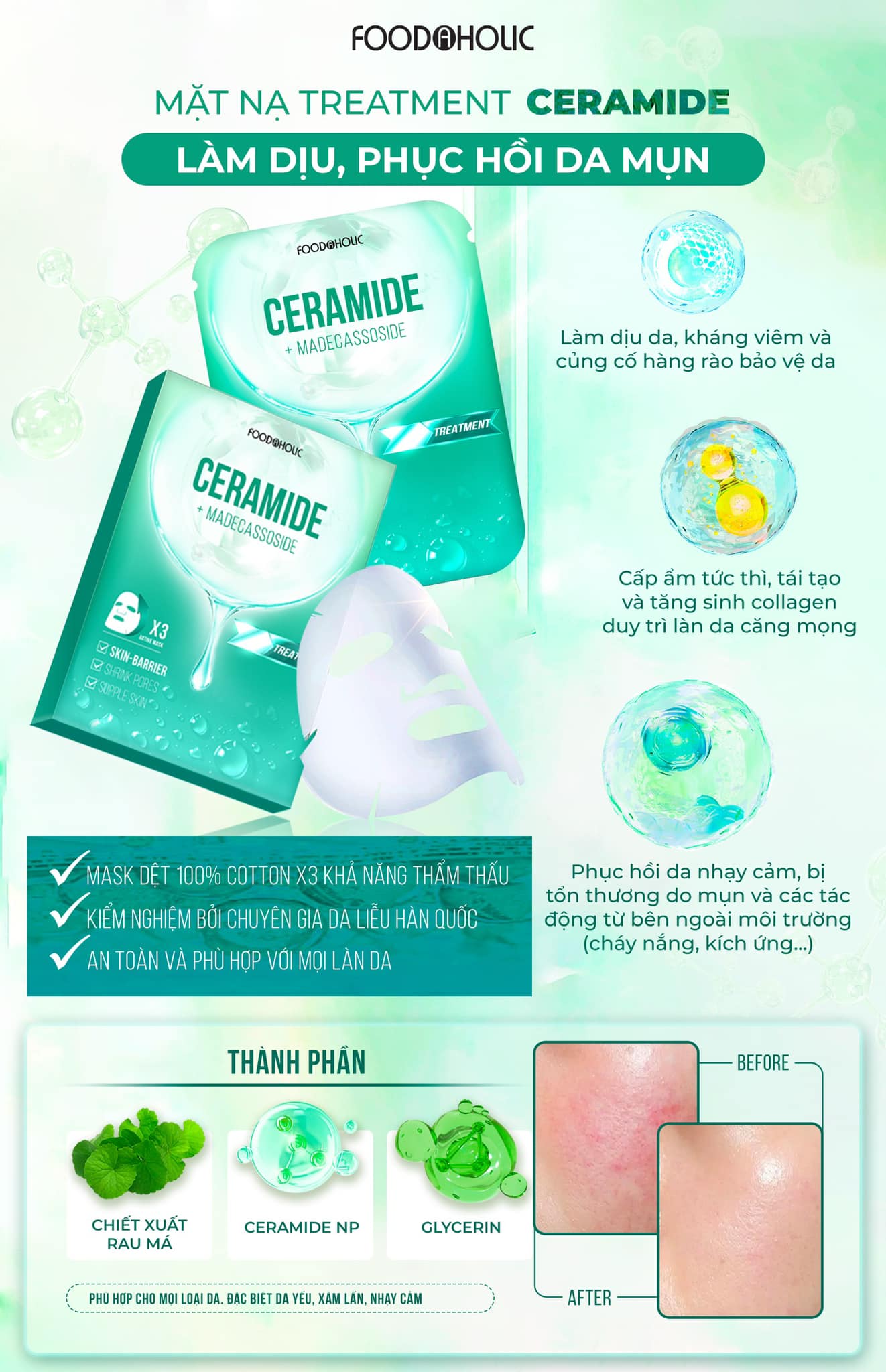- Mặt nạ có thành phần chính là Ceramide NP, Chiết xuất Rau má, Glycerin …. dòng mặt nạ Treatment là phương pháp làm đẹp tối ưu giúp làm dịu da, phục hồi với công thức an toàn nghiên cứu bởi chuyên gia da liễu Hàn Quốc an toàn cho mọi làn da.