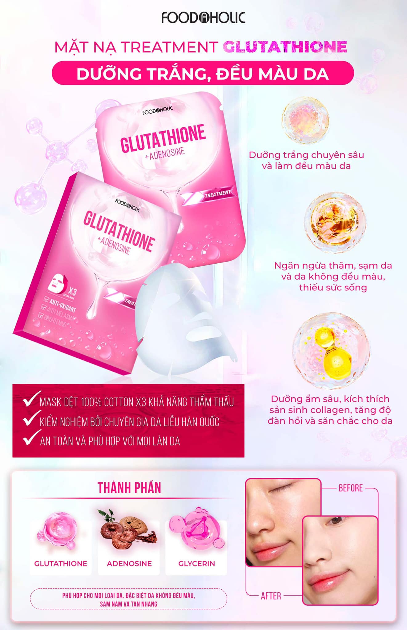 - Mặt nạ có thành phần chính là Glutathione, Adenosine, Glycerin …. dòng mặt nạ Treatment là phương pháp làm đẹp tối ưu giúp dưỡng trắng, đều màu da với công thức an toàn nghiên cứu bởi chuyên gia da liễu Hàn Quốc an toàn cho mọi làn da.