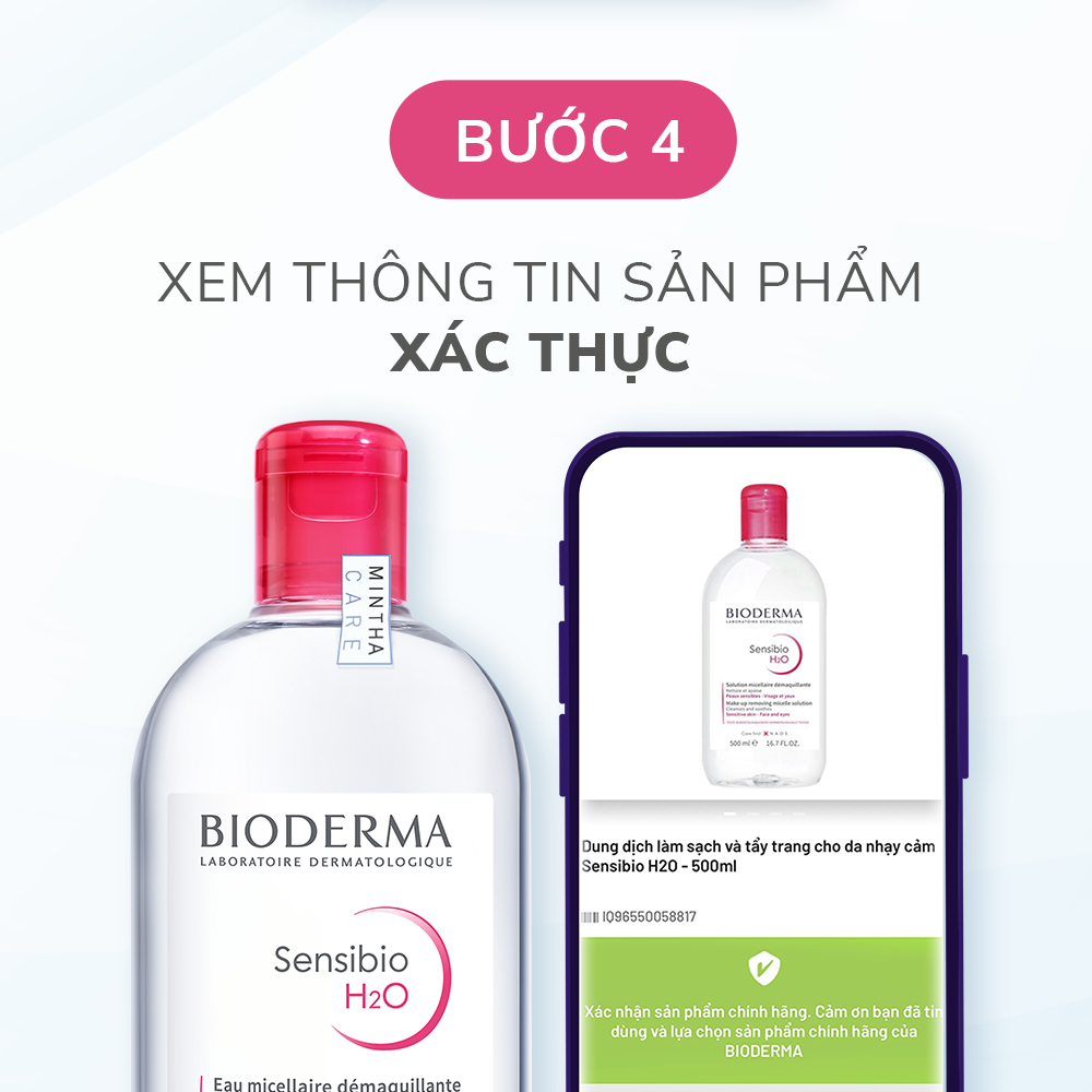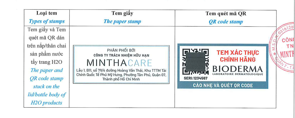 Bắt đầu từ ngày 19/07/2021, sản phẩm nước tẩy trang H2O thuộc nhãn hiệu Bioderma được nhập khẩu vào Việt Nam sẽ được gắn thêm tem quét mã QR. Như vậy, trên nắp/thân chai sản phẩm tẩy trang H2O sẽ được dán 02 loại tem sau: