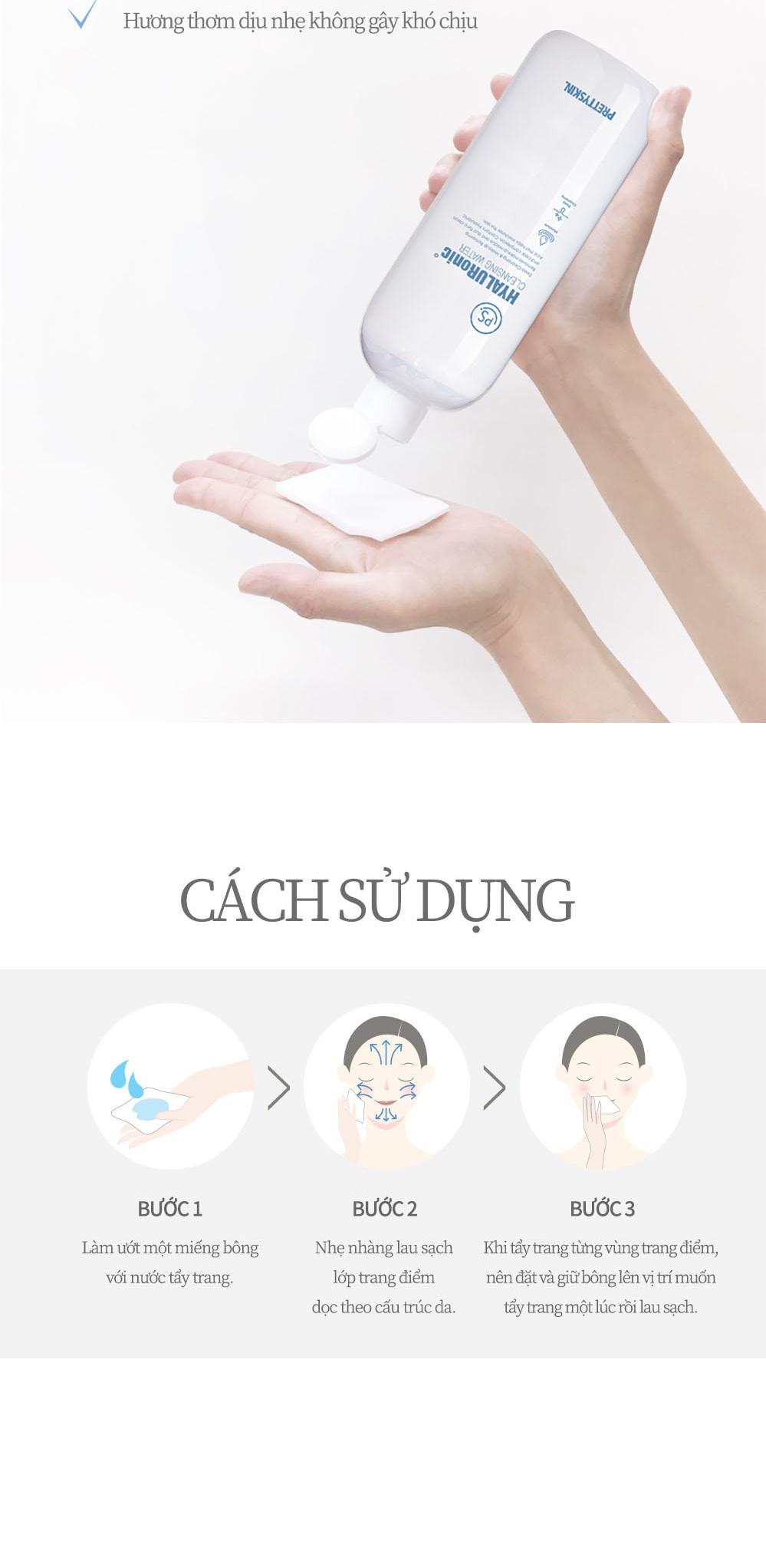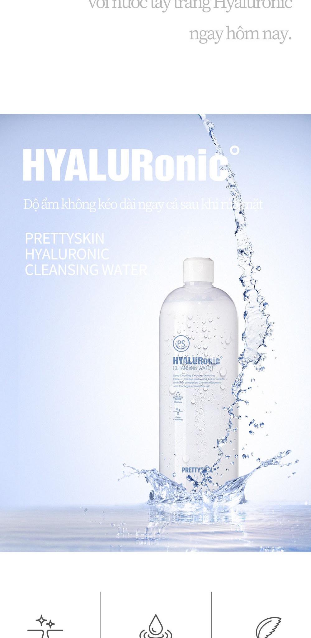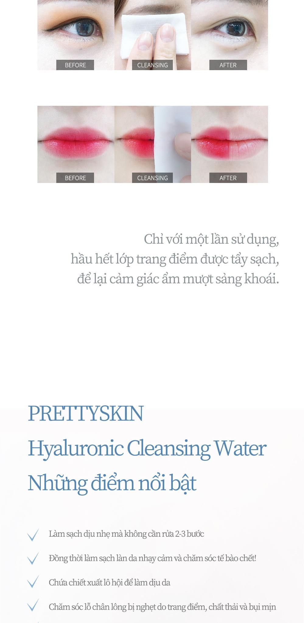 - Đặc biệt, PrettySkin Hyaluronic Cleansing Water làm sạch lớp trang điểm và bụi bẩn, giữ được độ ẩm mềm mại cho da.