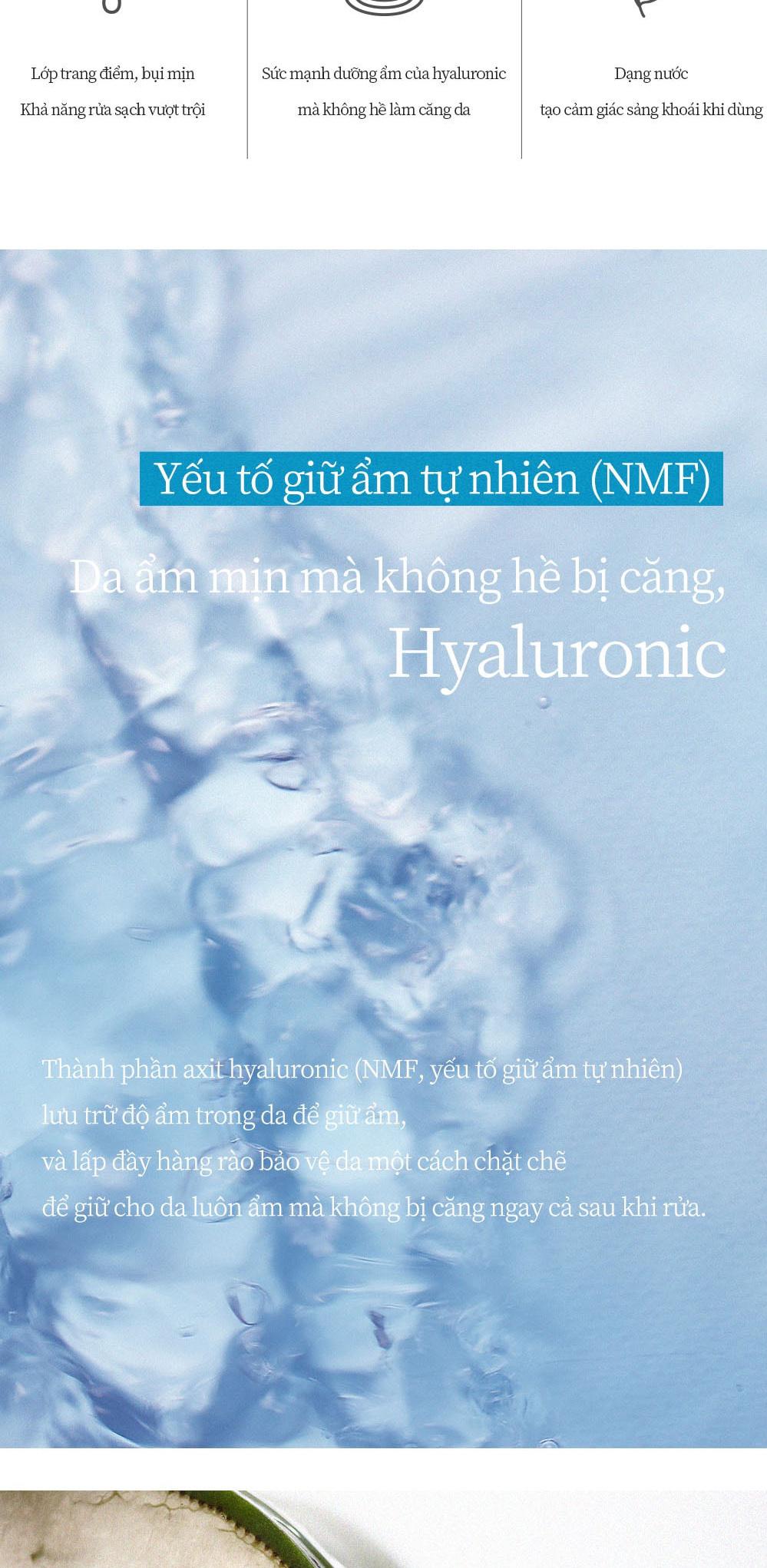 + Natural Moisturizing Factor (NMF): Axit Hyaluronic ngậm và giữ nước cực tốt, lưu giữ độ ẩm trong da và lấp đầy hàng rào bảo vệ da để giữ cho da ẩm mịn ngay cả sau khi rửa. Mang đến khả năng cấp ẩm hiệu quả nhất cho da khô.