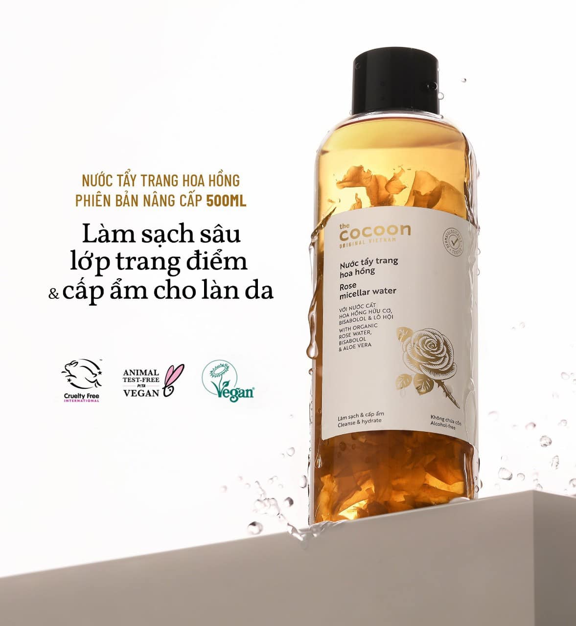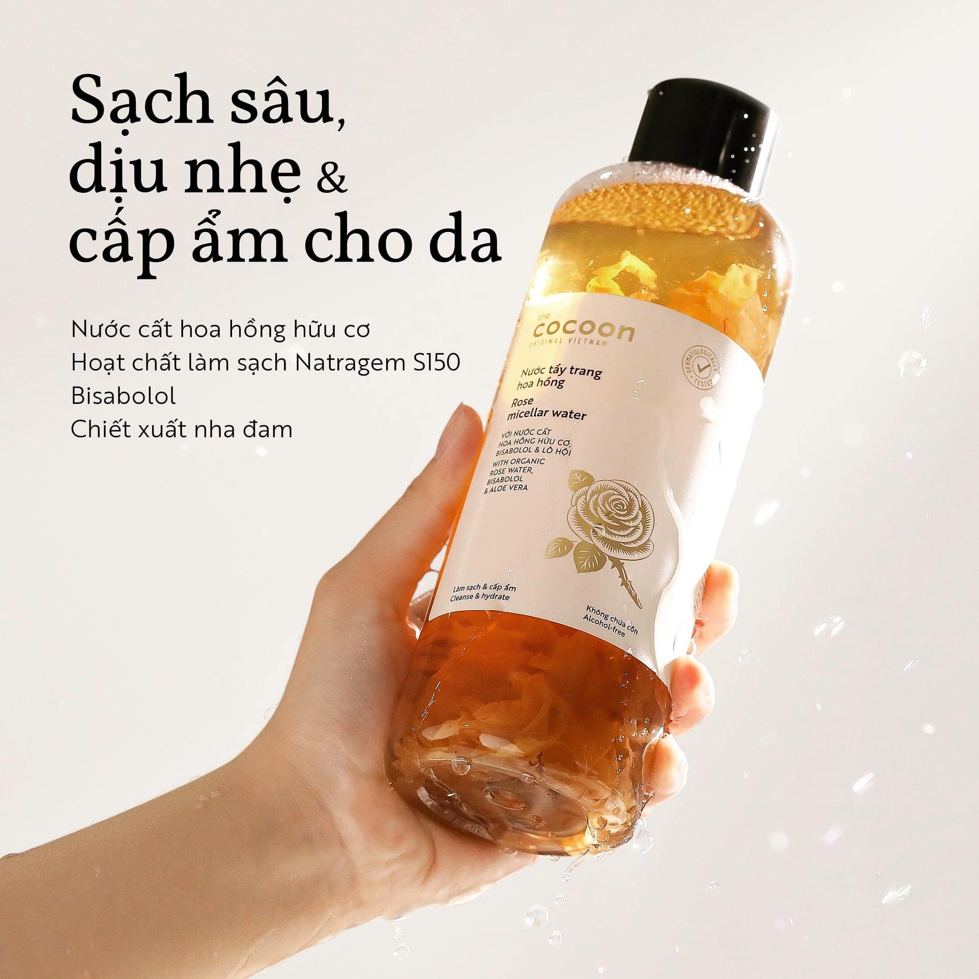 Nước Tẩy Trang Từ Nước Cất Hoa Hồng Hữu Cơ The Cocoon Rose Micellar Water là nước tẩy trang với nước cất hoa hồng hữu cơ tinh khiết kết hợp cùng công nghệ Micellar giúp làm sạch sâu lớp trang điểm, bụi bẩn, cấp ẩm và làm dịu da, mang lại làn da sạch và ẩm mịn thuộc thương hiệu mỹ phẩm thuần chay Cocoon đến từ Việt Nam.