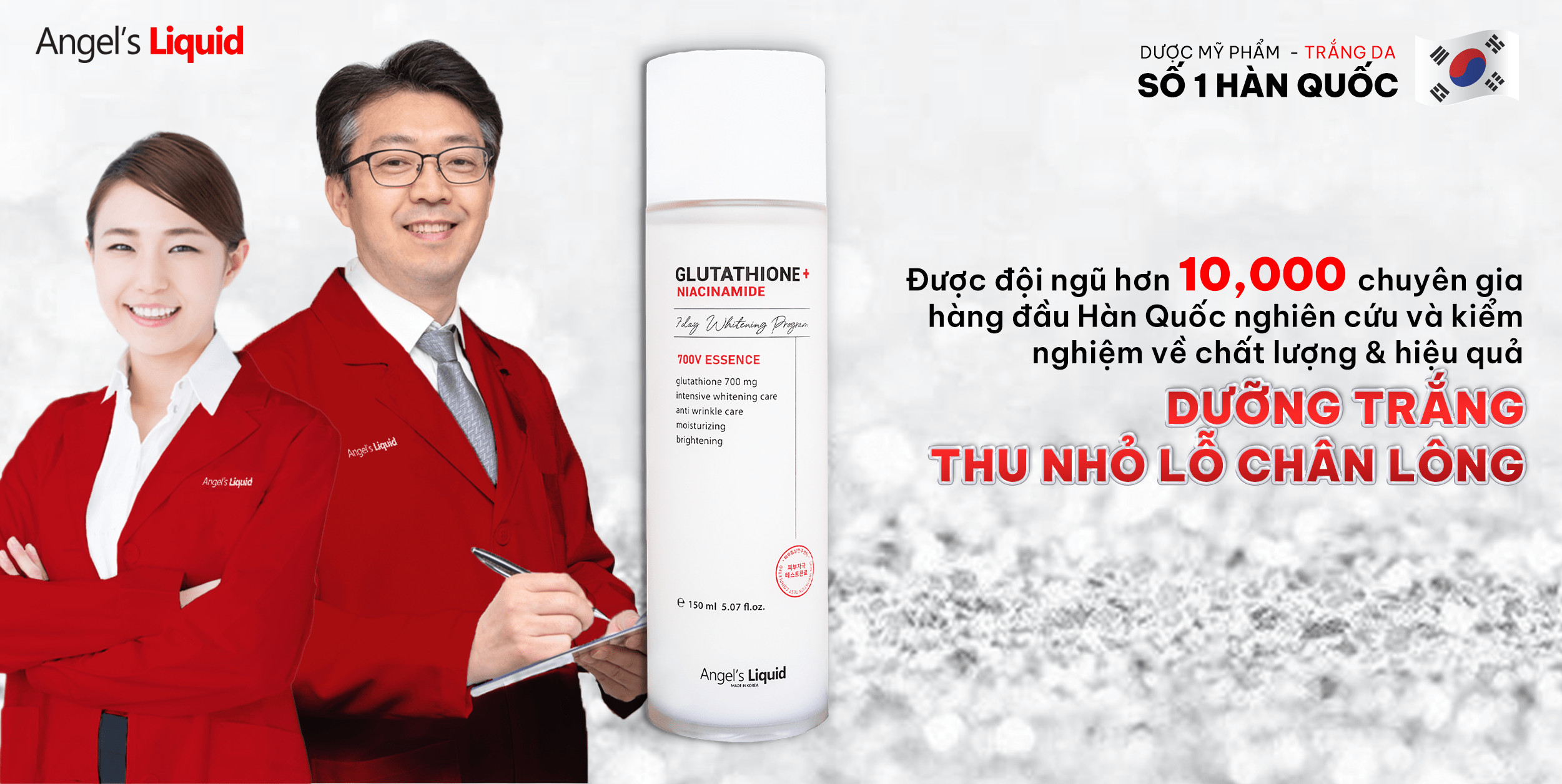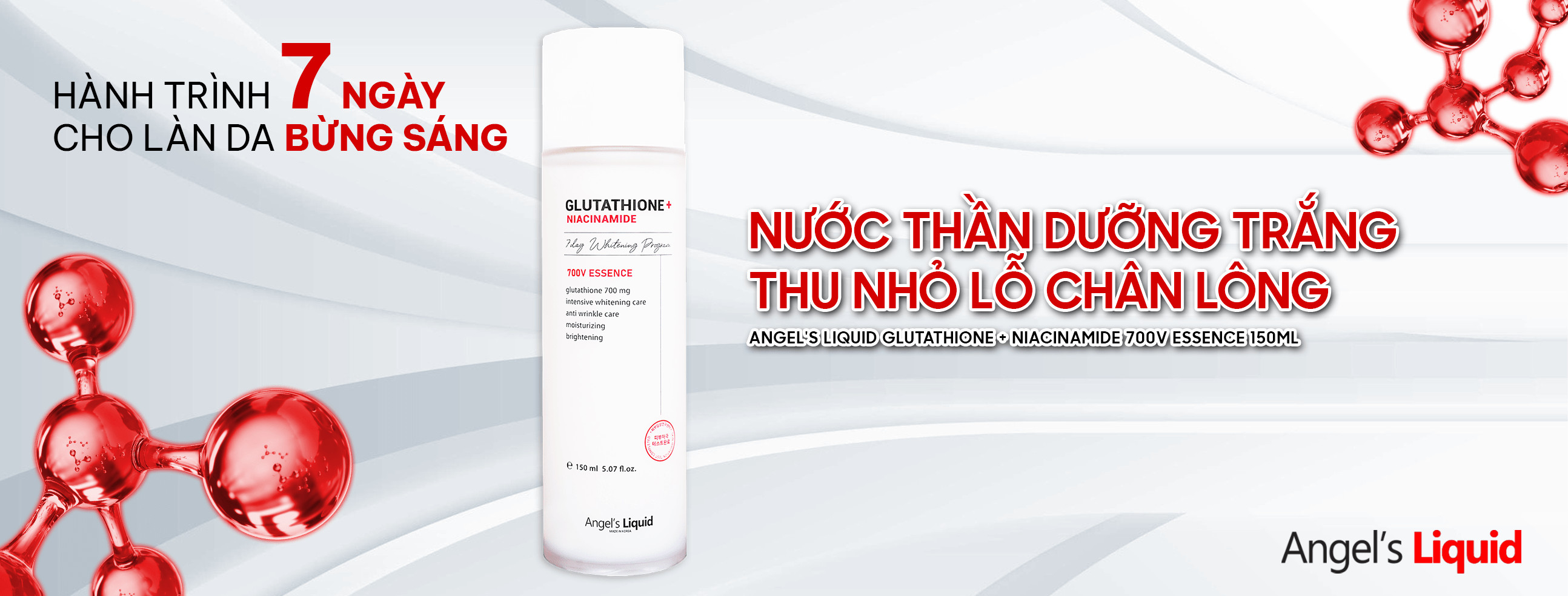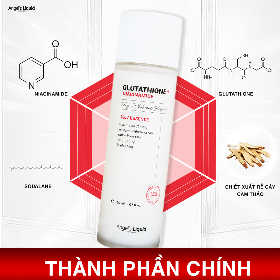 - Nước Thần Dưỡng Trắng, Thu Nhỏ Lỗ Chân Lông Angel's Liquid Glutathione + Niacinamide 7Day Whitening Program 700V Essence 150ml là phiên bản nâng cấp đặc biệt bổ sung hàm lượng Niacinamide 2000mg tăng khả năng dưỡng trắng và se khít lỗ chân lông, với kết cấu dạng essence cùng nồng độ hoạt chất cao giúp ức chế quá trình sản xuất Melanin, từ đó giảm thâm sạm, tàn nhang và loại bỏ nhanh chóng các vết thâm do mụn để lại.
