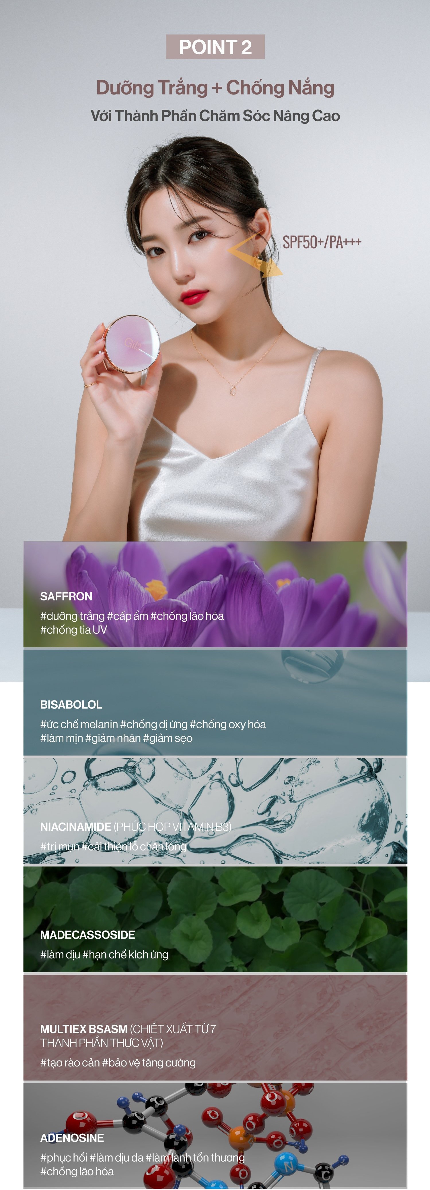 - Chỉ số chống nắng cao SPF50+/PA+++ giúp bảo vệ da khỏi tác hại từ môi trường bên ngoài