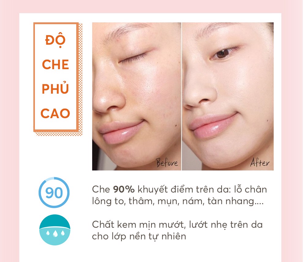 - Che phủ khuyết điểm hiệu quả, làm đều màu da, tạo lớp nền mỏng mịn và vô cùng tự nhiên.