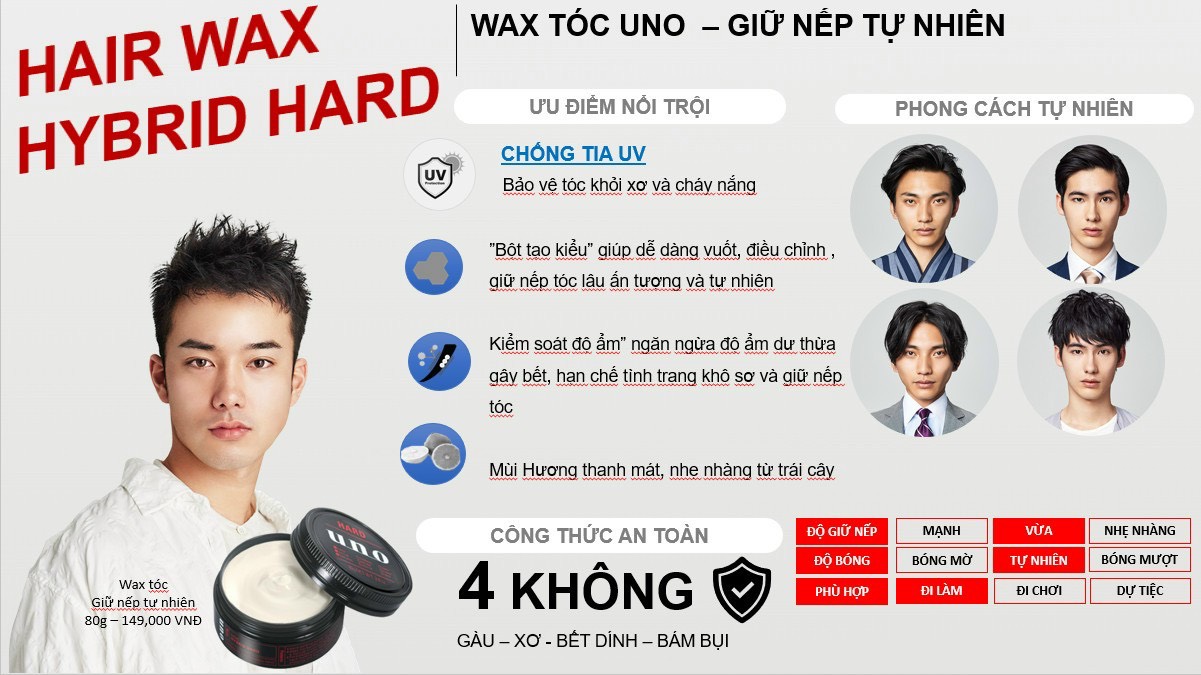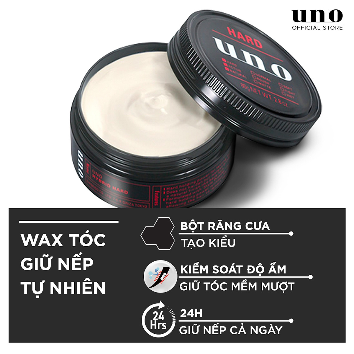 - Sáp Vuốt Tóc Giữ Nếp Tự Nhiên Uno Hybrid Hard có chứa bột răng cưa làm từ silica hạt mịn giúp định hình và tạo kiểu cho tóc; chứa các thành phần có khả năng kiểm soát độ ẩm, giúp ngăn chặn độ ẩm của môi trường ảnh hưởng đến kiểu tóc, ngăn tóc bị bết dính và giúp duy trì kiểu tóc lâu dài; giúp giữ nếp tóc lâu dài mà không bám bụi, không gây gàu, không gây bết dính và không làm tóc bị khô xơ hay bị cứng tóc; giúp đem lại vẻ đẹp tự nhiên cho mái tóc và có khả năng bảo vệ tóc trước tác hại của tia UV.