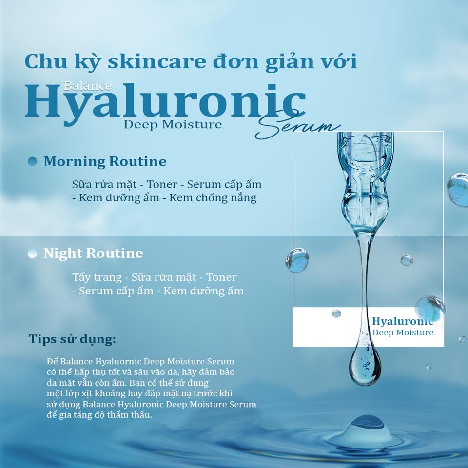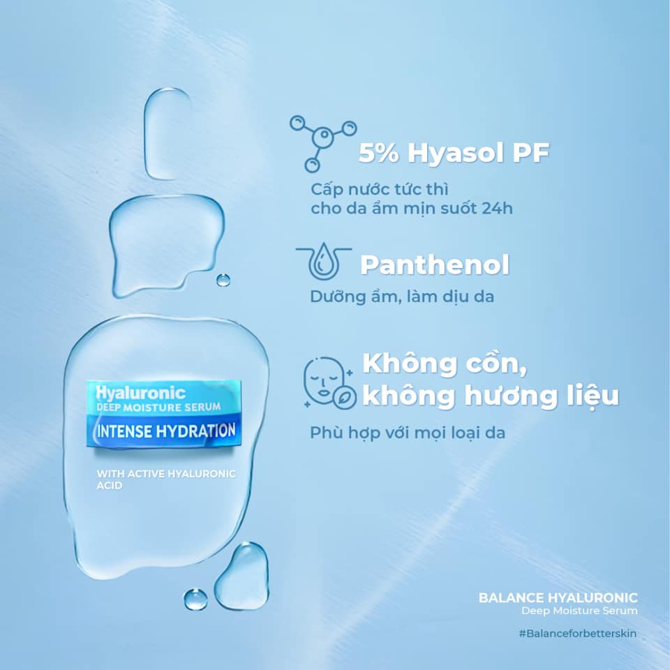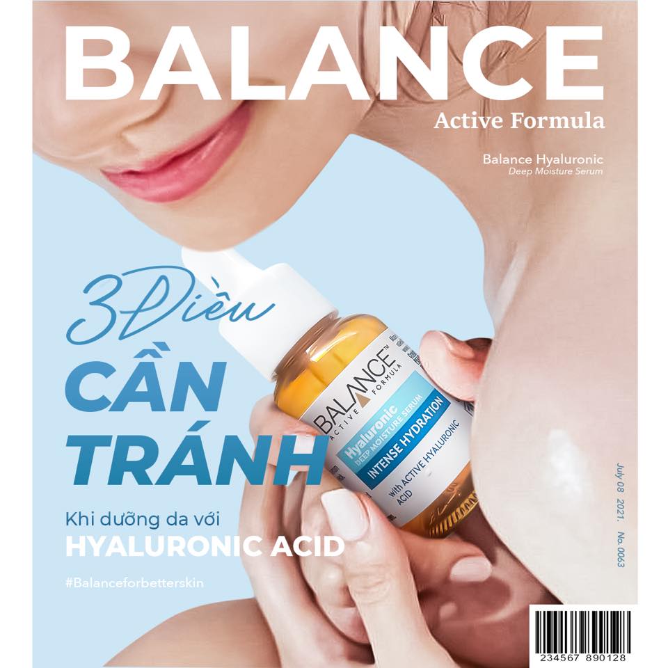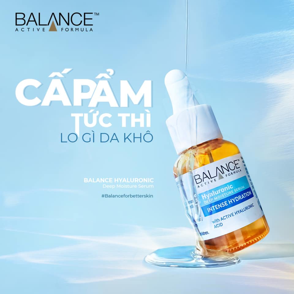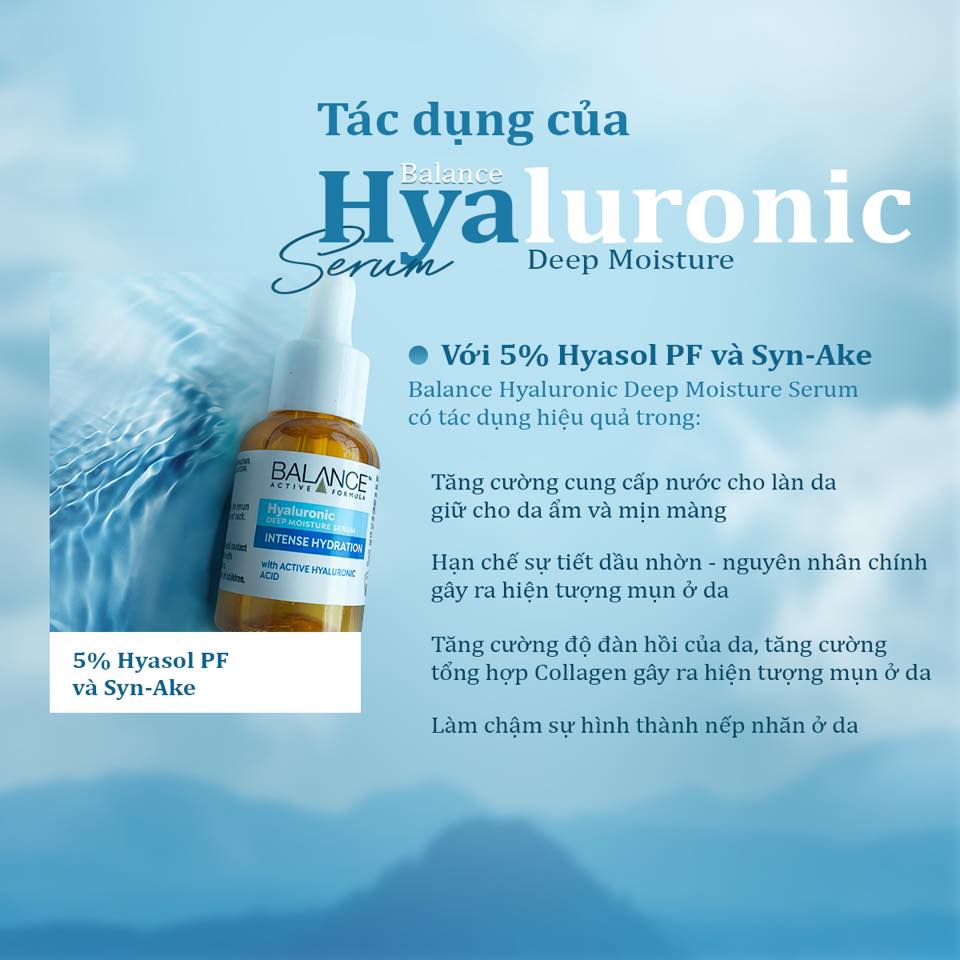 Tinh Chất Cấp Nước Dưỡng Ẩm Balance Active Formula Hyaluronic Deep Moisture Serum là tinh chất thuộc thương hiệu Balance Active Formula có chứa 5% thành phần đặc biệt Hyasol PF - một loại Hyaluronic Acid siêu dưỡng ẩm, cấp nước và ngậm nước cho da giúp làn da trông tươi tắn ẩm mịn hơn. Đồng thời có hiệu quả trong việc cải thiện độ đàn hồi cho da và giảm các dấu hiệu lão hóa.