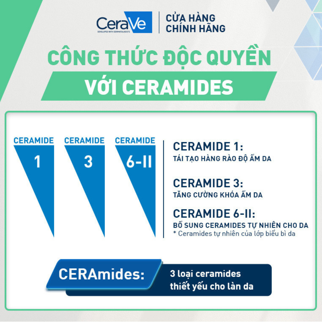 - Ceramides 1, 3, 6-II giúp phục hồi lại lớp màng bảo vệ da tự nhiên, đồng thời củng cố độ khỏe của làn da. Từ đó làn da bạn sẽ giảm thiểu được việc kích ứng, mẩn đỏ sau khi rửa mặt.