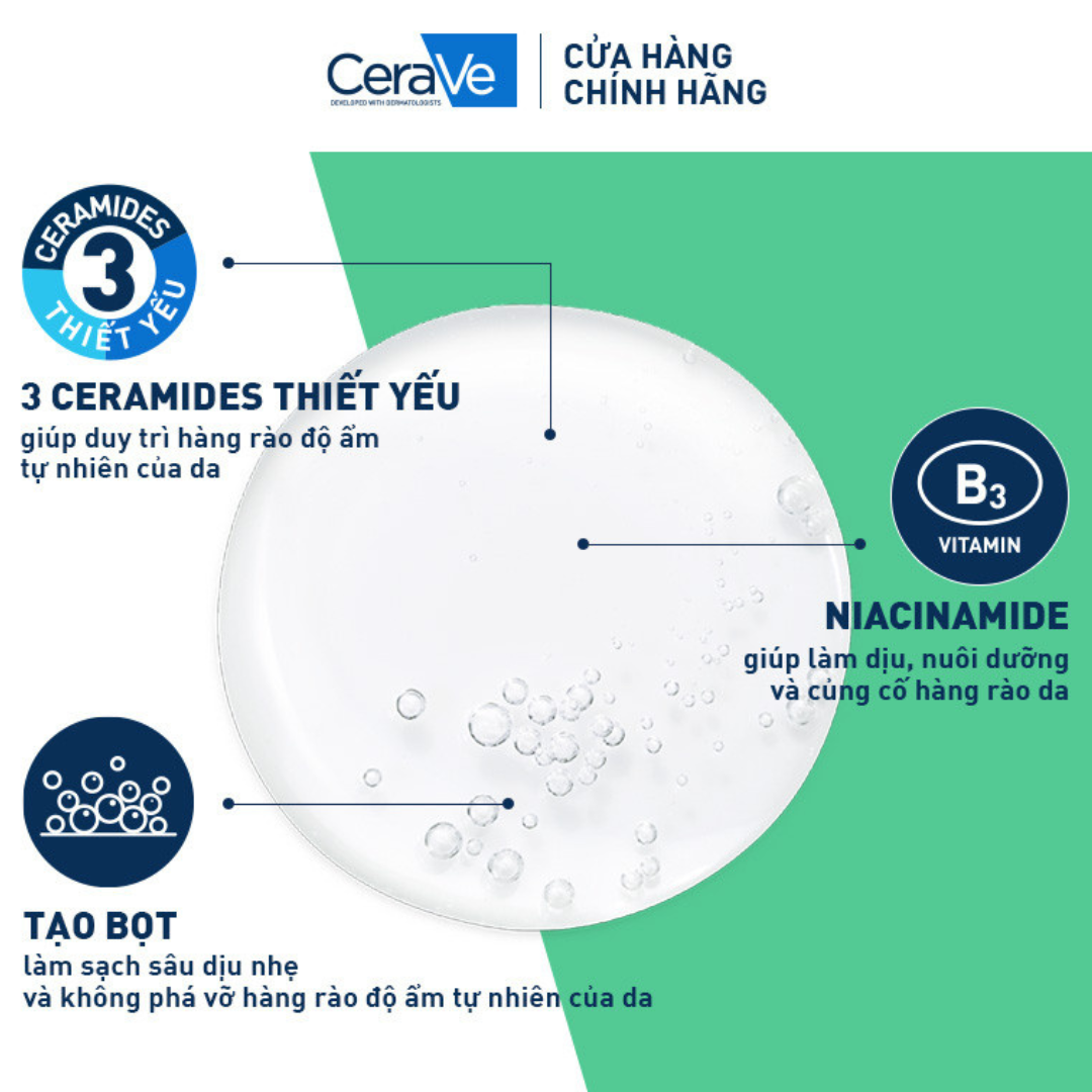 Với pH ở mức tốt ~ 5.5, CeraVe Foaming Cleanser nhẹ nhàng lấy đi bụi bẩn, dầu thừa, tàn dư của lớp make up mà không làm tổn hại đến lớp màng ẩm của da. Các chức năng bảo vệ tự nhiên của da được phục hồi và duy trì, vì thế hạn chế được tình trạng vi khuẩn xâm nhập vào da, tránh tình trạng gây mụn và kích ứng, da sạch nhưng vẫn mềm, mịn, không hề có cảm giác căng rát như khi sử dụng các loại sữa rửa mặt có độ pH cao.