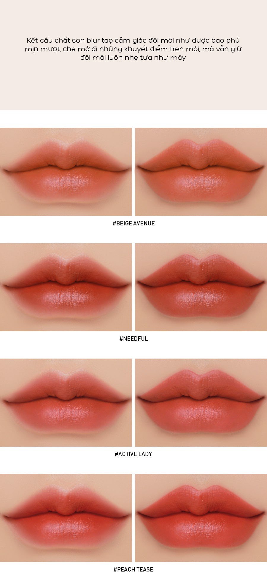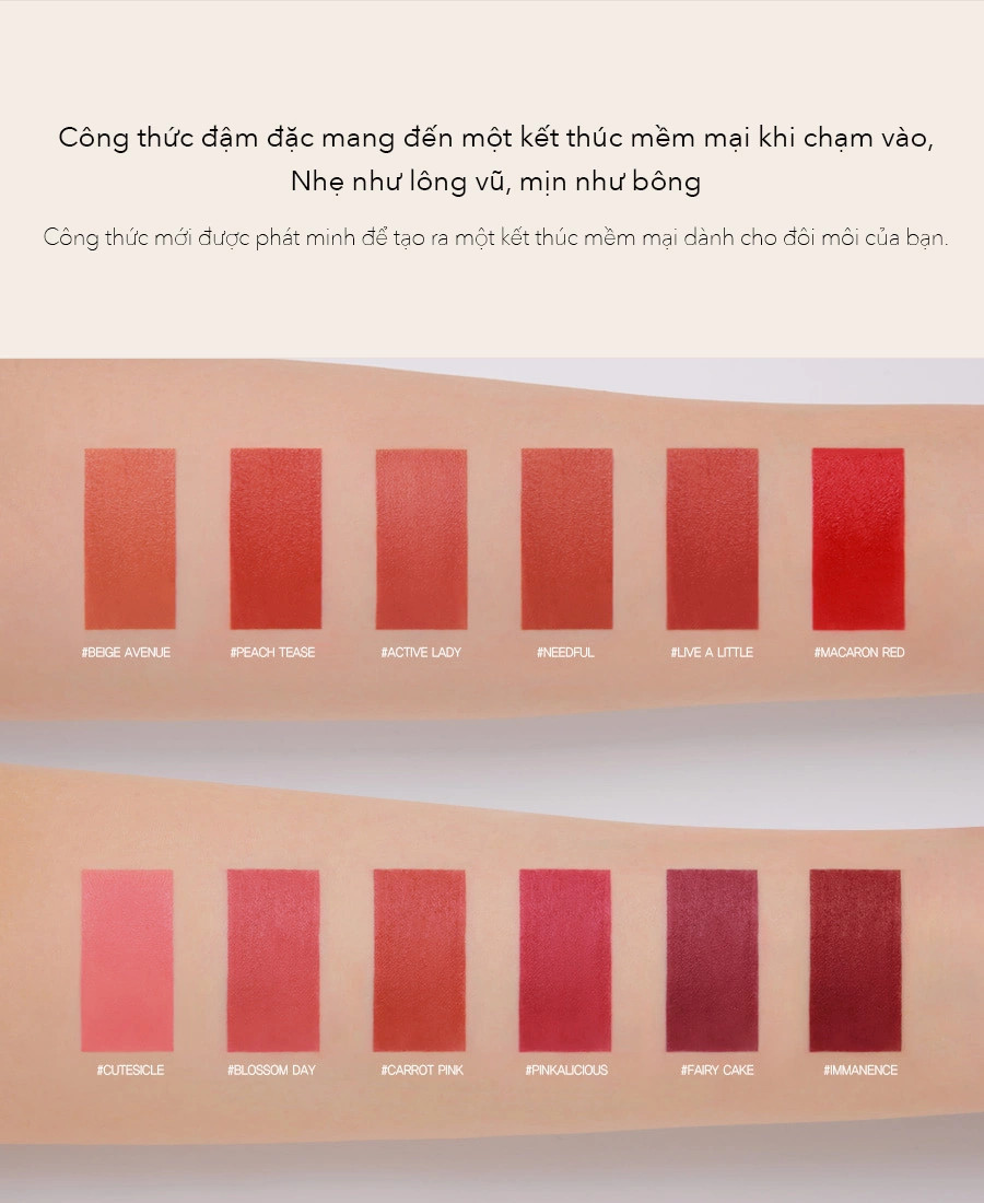 - Son có kết cấu mướt mịn, khi lướt trên môi tạo cảm giác phủ đều mà không làm lộ nếp nhăn hay vân môi.