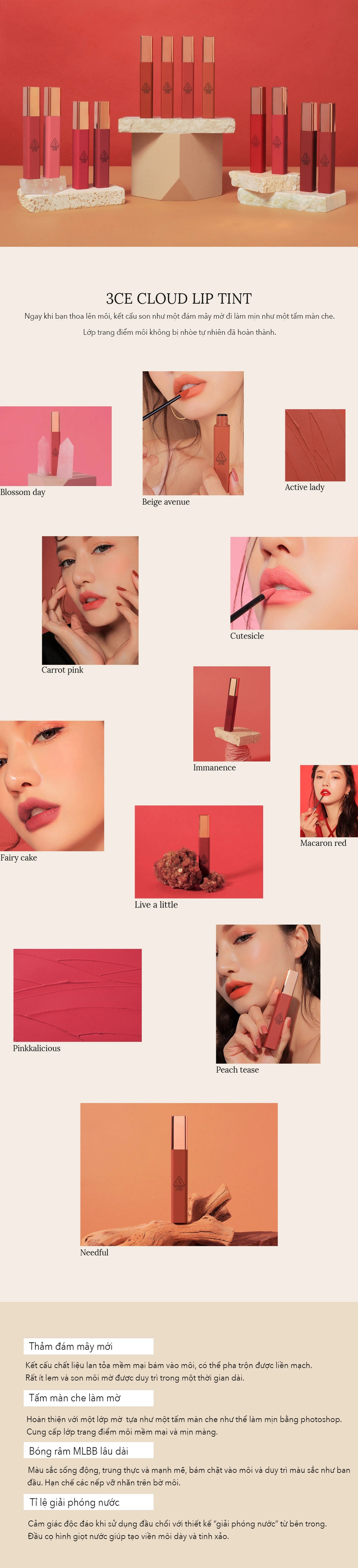 - Son kem lì 3CE Cloud Lip Tint hiện tại đã có mặt tại Garden Shop có thiết kế nổi bật với thân son trùng màu với màu son bên trong và nắp son có màu ánh đồng đơn giản nhưng vẫn tinh tế, sang trọng.