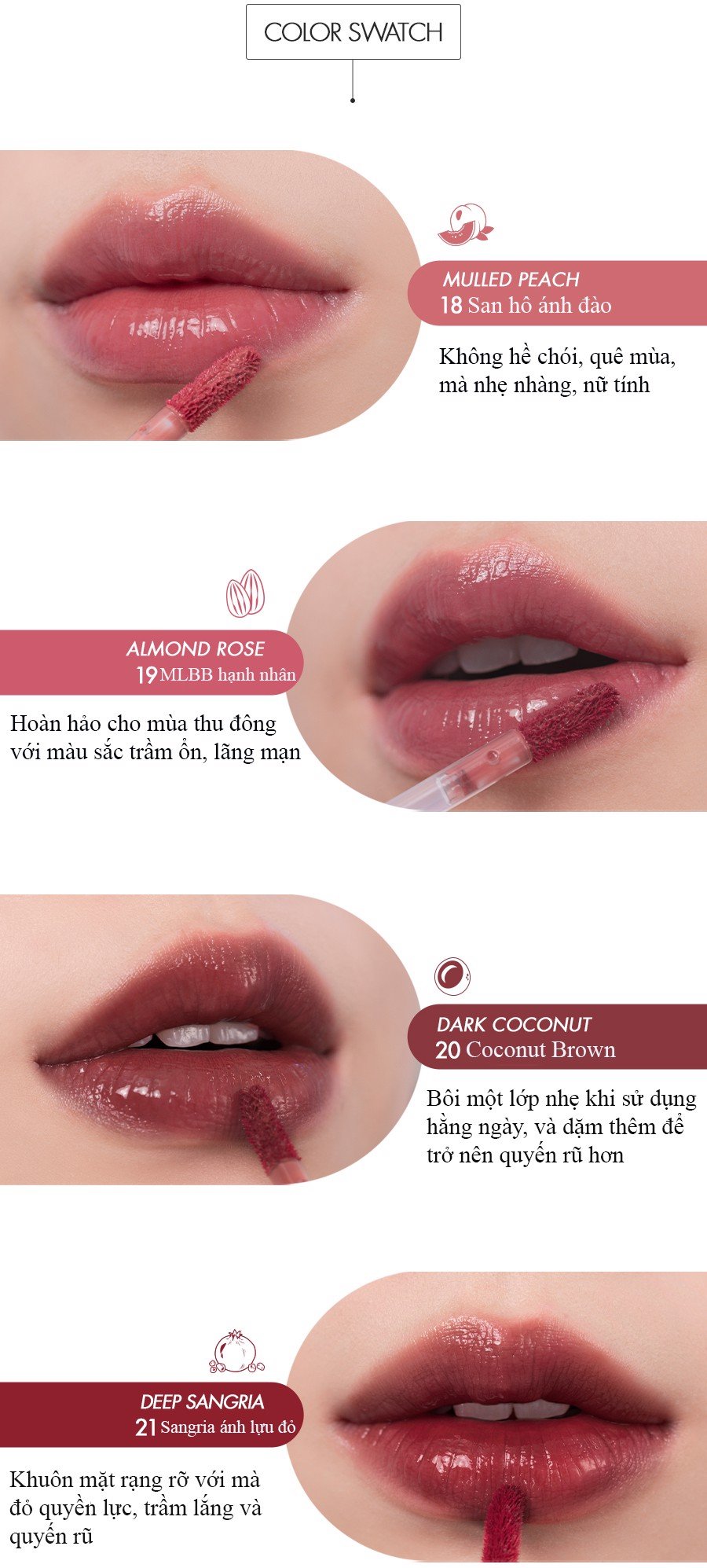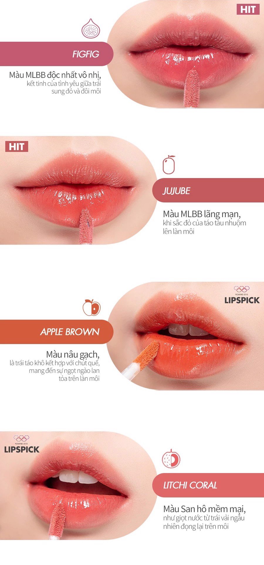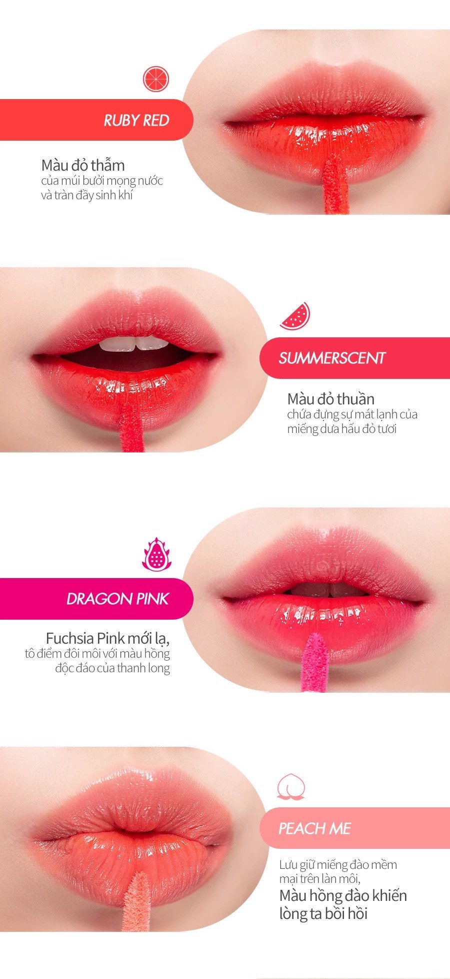 - Kết cấu son dạng tint bóng khi lướt trên môi mang cảm giác tươi mát, không bị dính môi rất dễ chịu