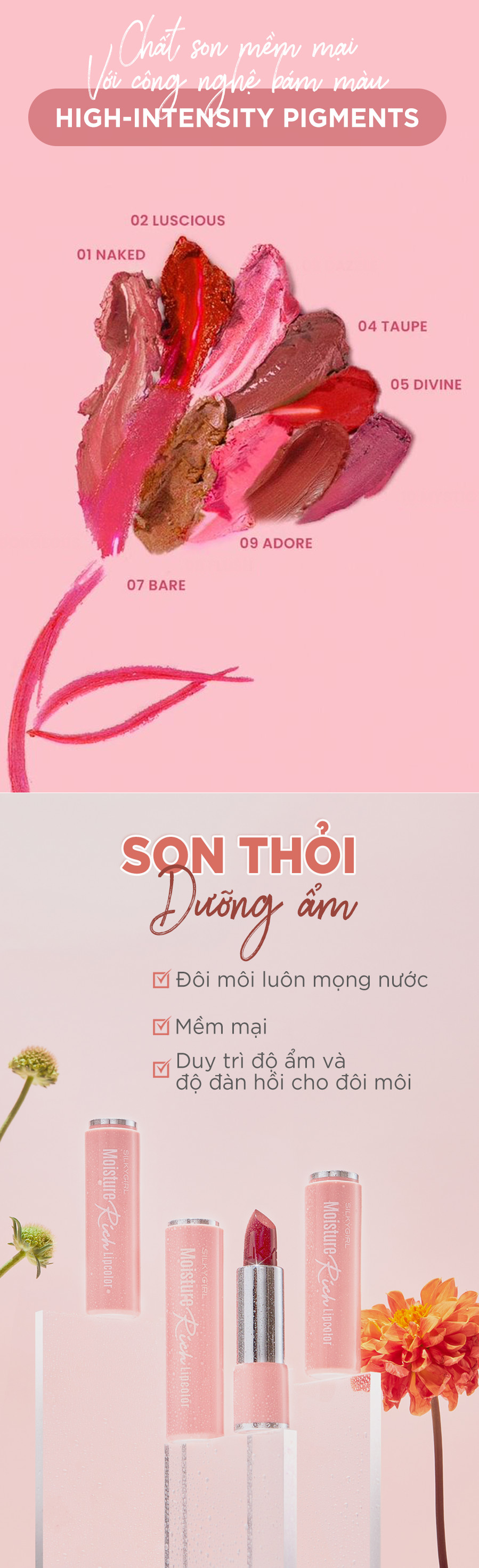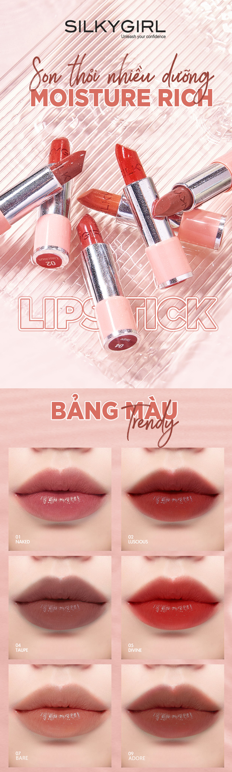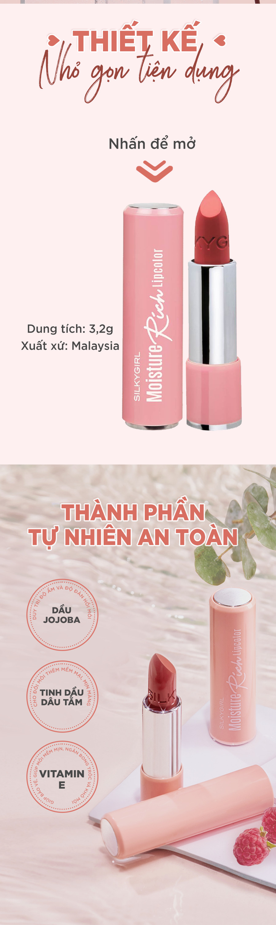 - Son Thỏi Màu Có Dưỡng, Dưỡng Ẩm Môi Mềm Mại Silkygirl Moisture Rich Lipcolor với thành phần từ tinh dầu dâu tằm, dầu Jojoba và vitamin E giúp bảo vệ và cho đôi môi thêm mềm mại, mịn màng, duy trì độ ẩm và độ đàn hồi môi, giúp môi mềm mịn, ngăn bong tróc và khô môi.