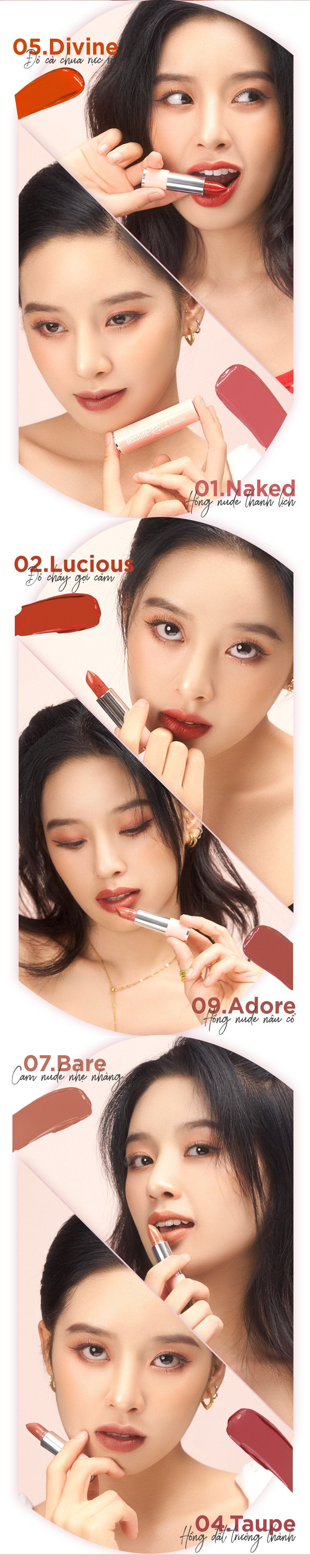 • 01 Naked: là màu hồng gỗ hay hồng nâu da tự nhiên, Sự pha trộn giữa màu hồng có chút nâu gỗ nhẹ nhàng, tạo nên sự êm dịu, nữ tính cho người dùng. Màu son số 1 này không kén người sử dụng, phù hợp đi học, đi làm và ngay khi ở nhà.