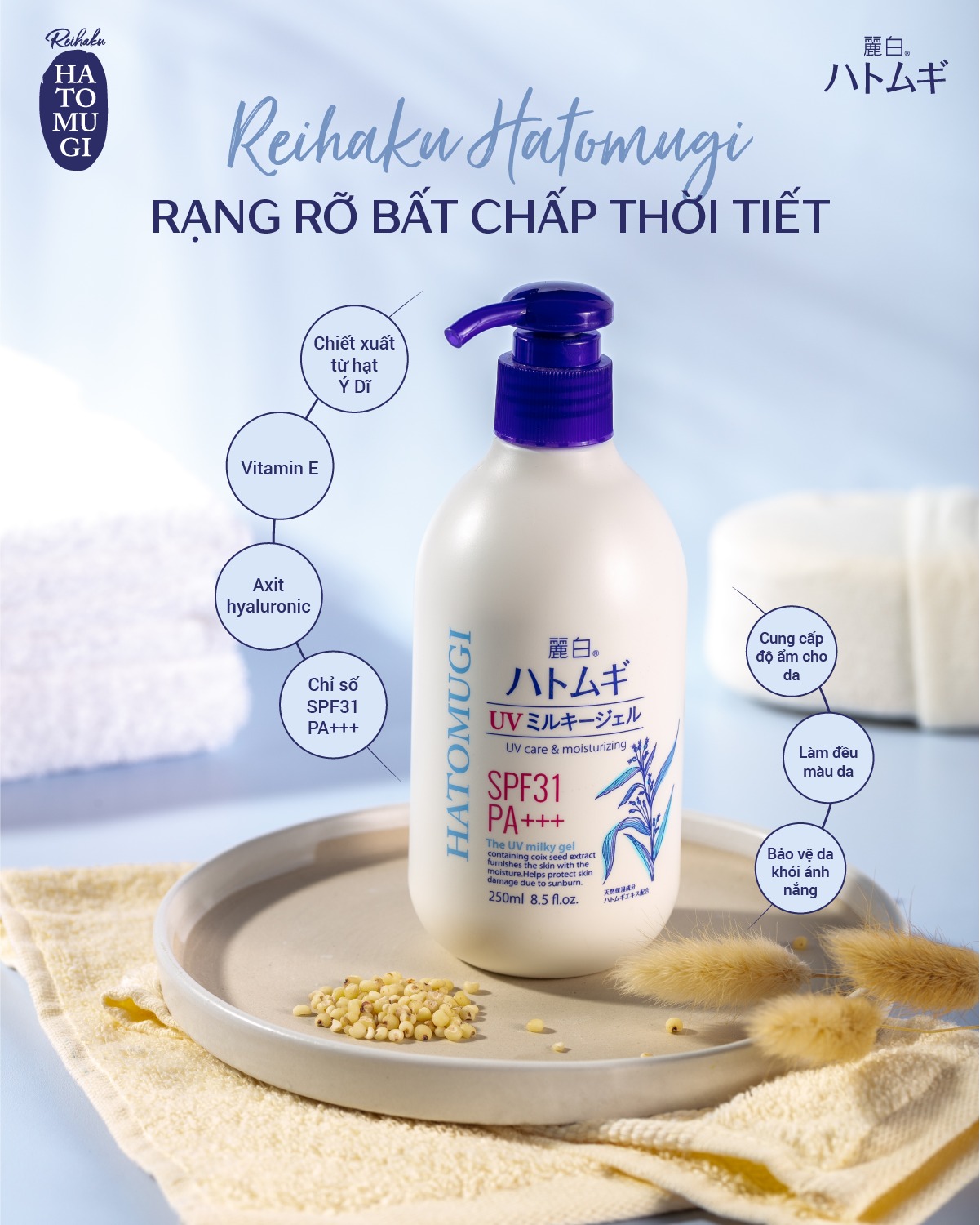 - Ngoài ra, sữa dưỡng thể Hatomugi còn chứa thành phần chống nắng SPF 31+++ (chỉ số chống nắng khá cao) giúp bảo vệ da khỏi tác động của tia UV (một trong những nguyên nhân gây thâm nám, sạm da).