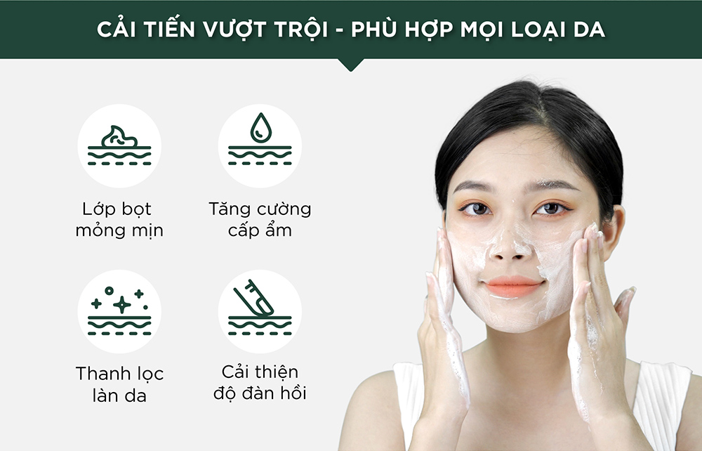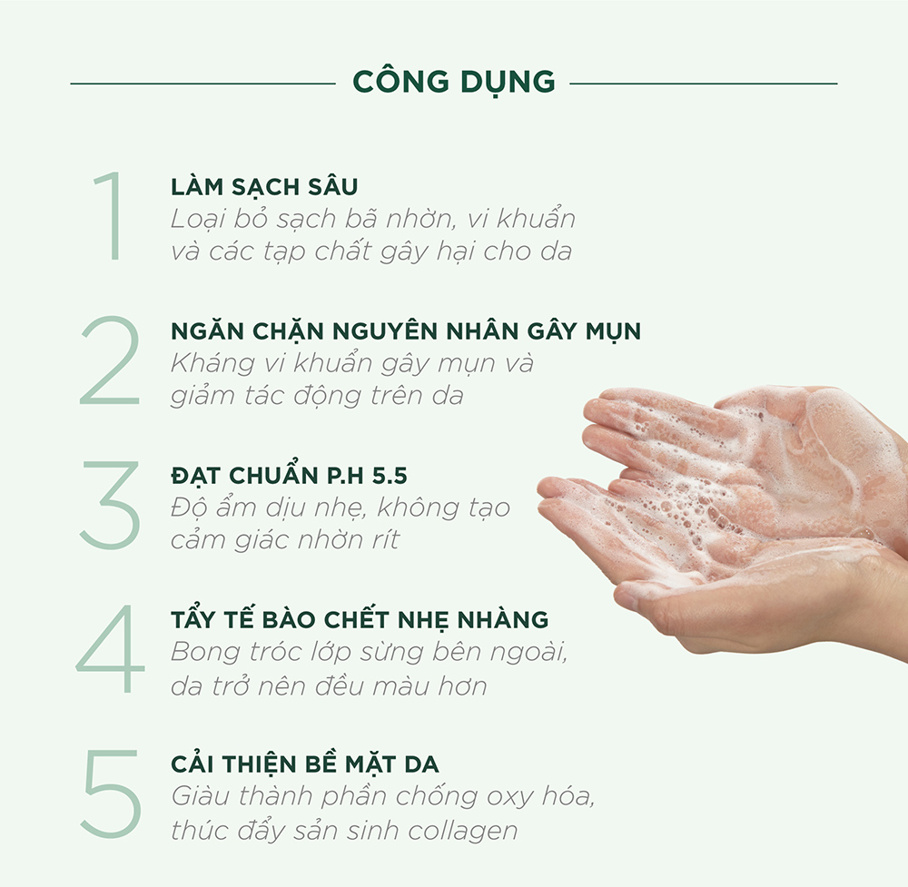 - Kết cấu dạng kem, tạo bọt bông mịn và p.H chuẩn 5.5 an toàn cho da và cung cấp độ ẩm nhẹ dịu