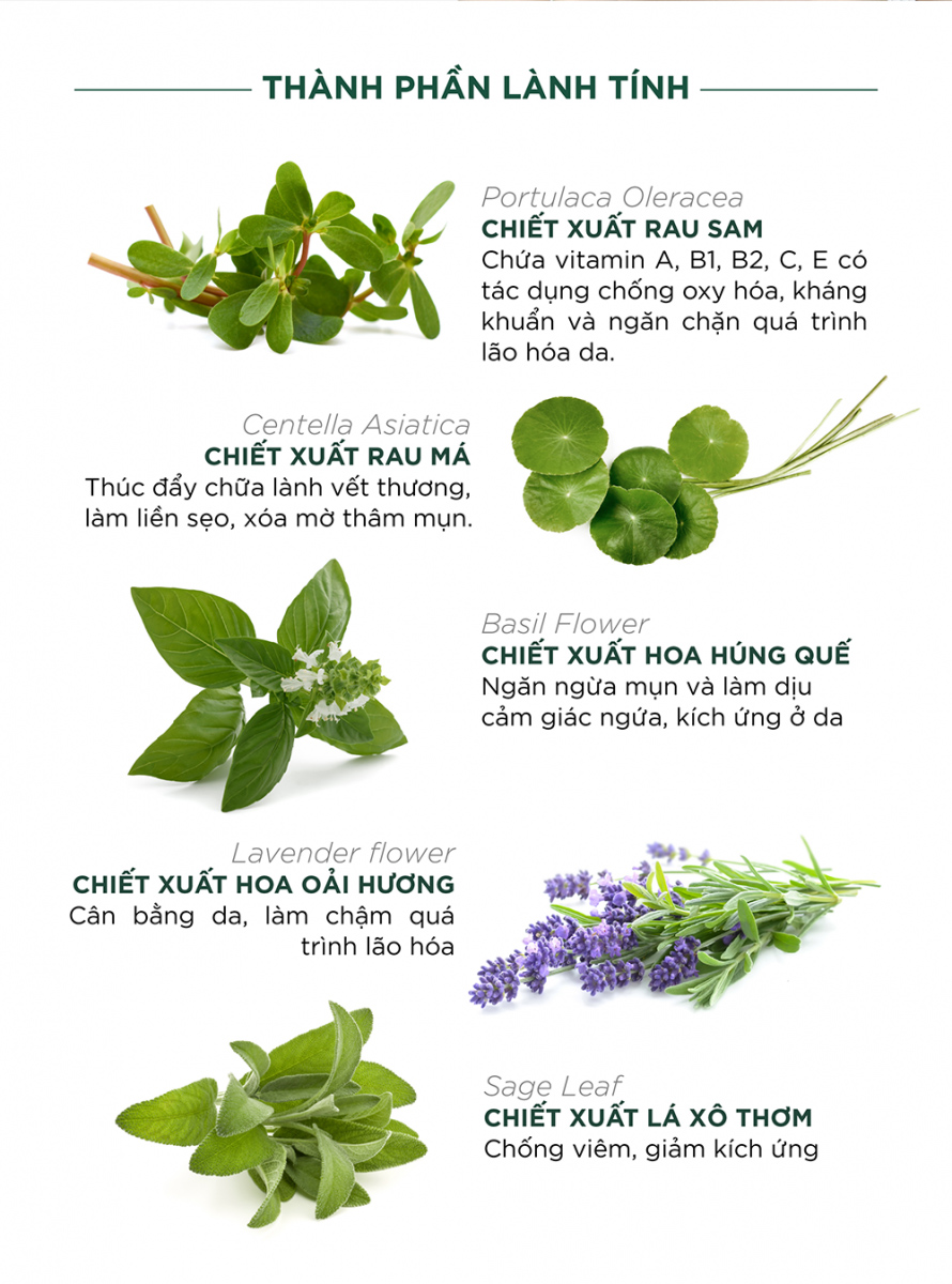 - Với thành phần chính là chiết xuất rau sam chứa giàu các chất dinh dưỡng và hợp chất chống lão hóa, có đặc tính chống viêm, chống oxy hóa, làm se và hỗ trợ chữa lành vết thương, giúp đẩy nhanh quá trình chữa lành da bị tổn thương một cách hiệu quả.