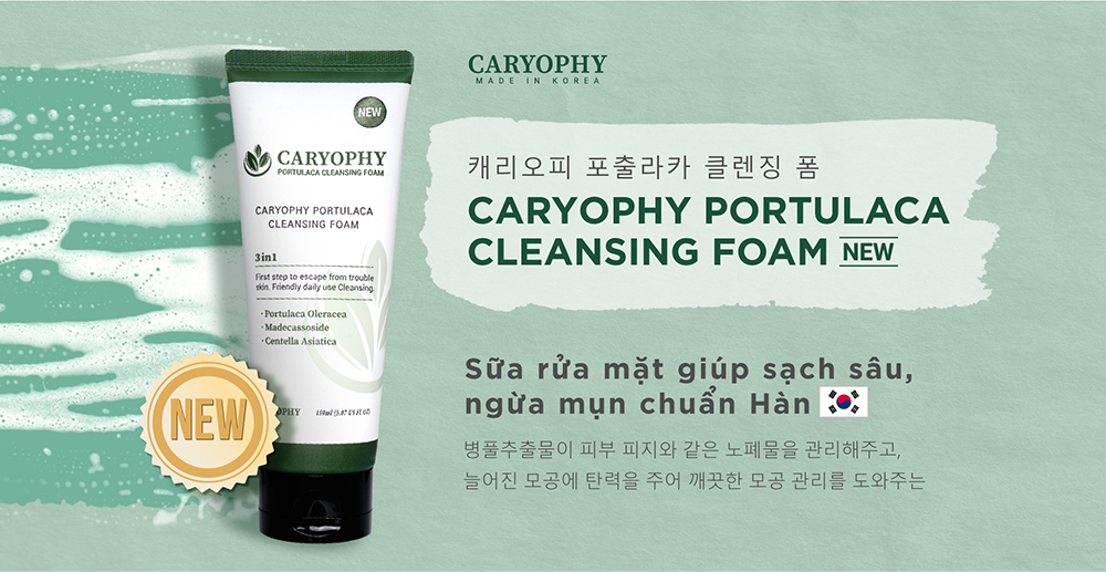 Caryophy Portulaca Cleansing Foam là dòng sản phẩm sữa rửa mặt dành cho da mụn đến từ thương hiệu mỹ phẩm Caryophy của Hàn Quốc. Công thức chứa chiết xuất từ các thành phần thiên nhiên an toàn, dịu nhẹ cho da, trong đó nổi bật với 3 thành phần chính là chiết xuất rau sam, rau má và lá nhân trần giúp ngăn ngừa và làm giảm mụn hiệu quả.
