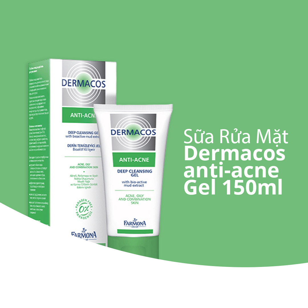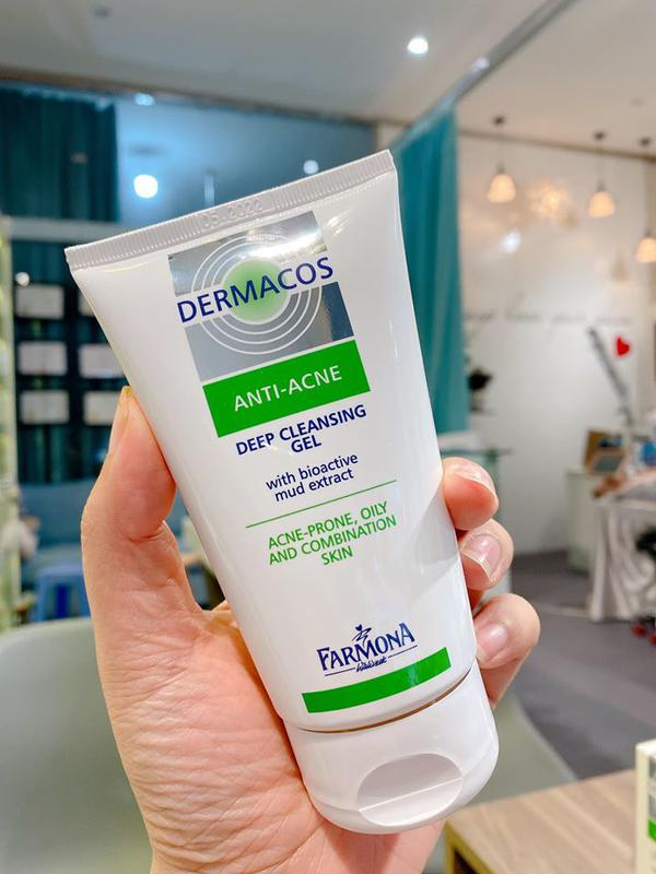 - Gel rửa sạch sâu, ngừa mụn Dermacos Anti-Acne Deep Cleansing Gel làm sạch da, giúp loại bỏ mọi bụi bẩn, lượng dầu dư thừa trên da, thông thoáng lỗ chân lông.