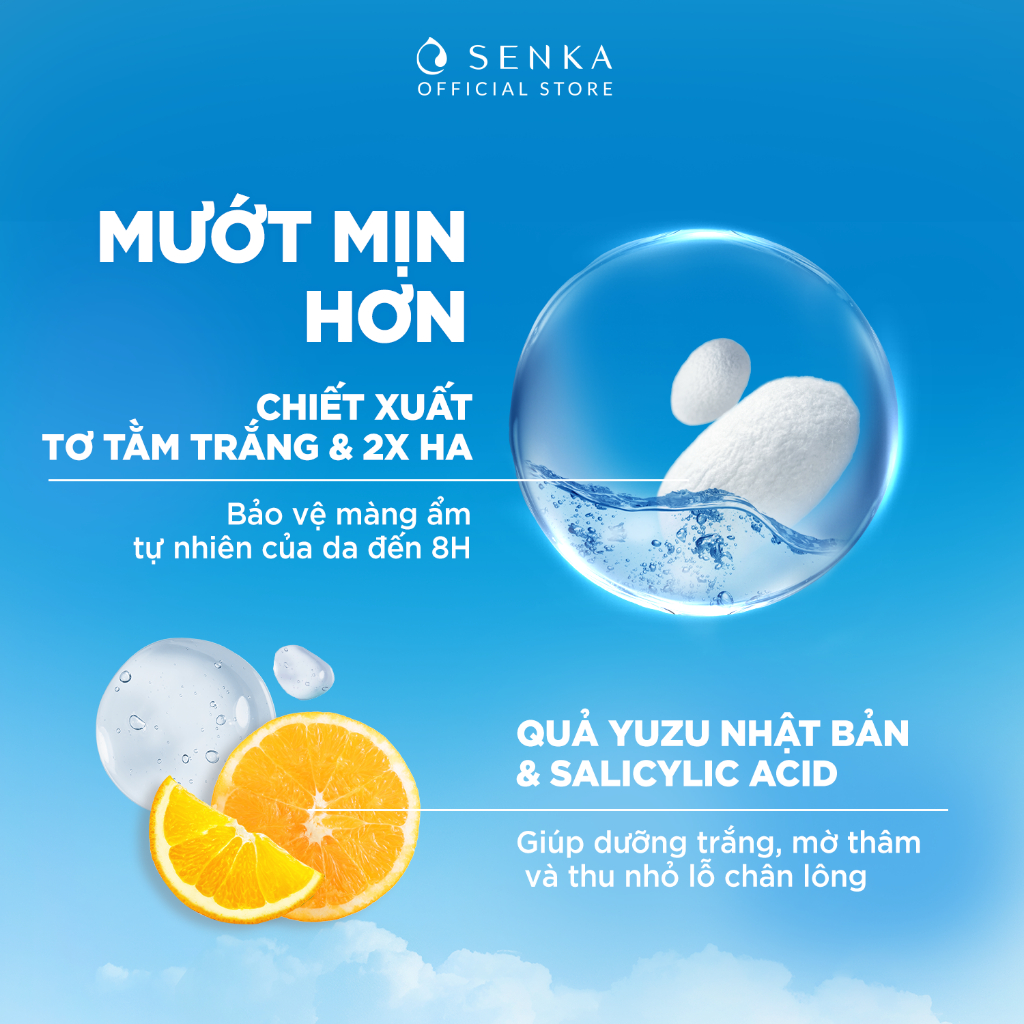 - Chiết xuất Tơ tằm trắng và gấp đôi Hyaluronic Acid giúp bảo vệ màng dưỡng ẩm tự nhiên của da, da sạch hoàn hảo nhưng vẫn ẩm mịn.