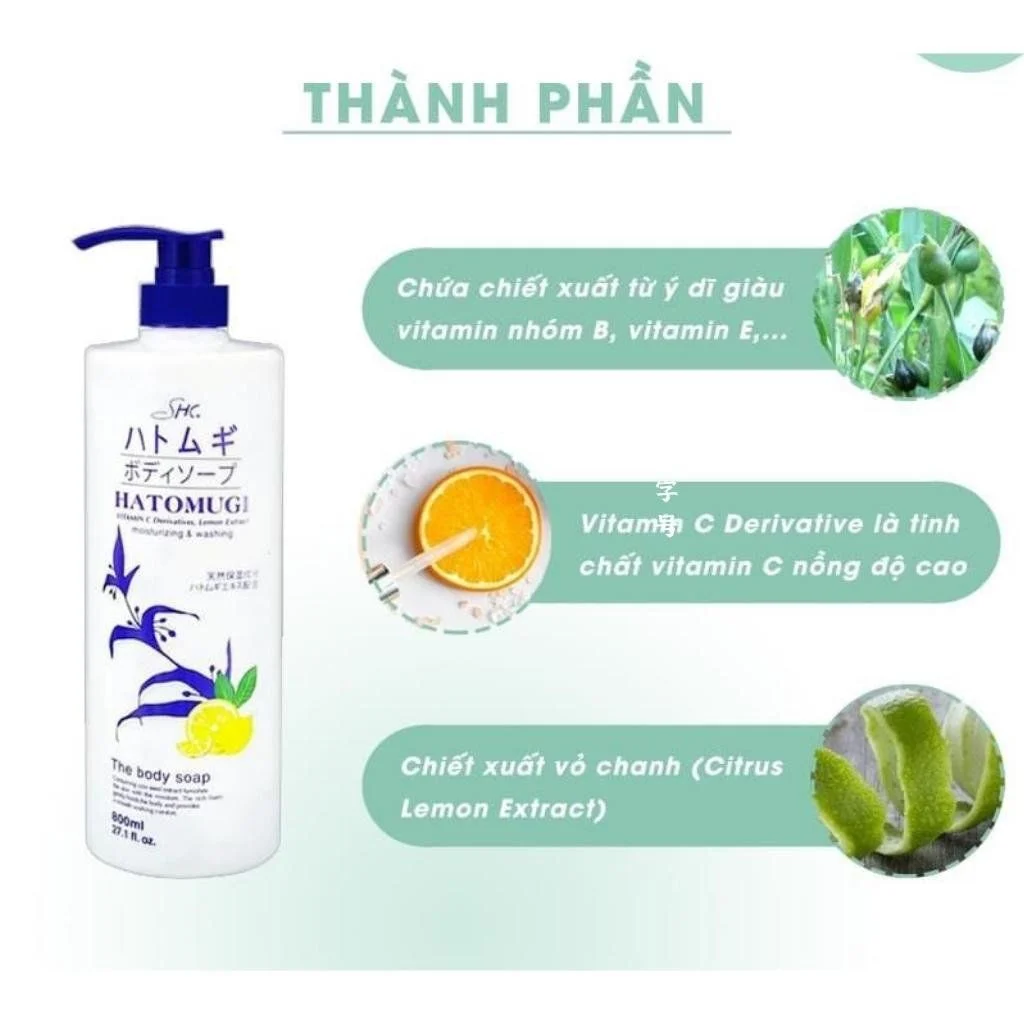 Sữa Tắm Hatomugi Vitamin C Chiết Xuất Ý Dĩ Làm Sáng Da 800ml là sữa tắm phiên bản nâng cấp có chứa thành chính là cây ý dĩ ngoài ra còn có Vitamin C chiết xuất từ vỏ chanh vàng giúp làm sạch da một cách nhẹ nhàng, lấy đi tế bào chết giúp da thông thoáng, cung cấp độ ẩm cho da mịn màng, căng mướt, và trắng da , làm dịu. Là sản phẩm thường xuyên được các tạp chí đứng đầu tại Nhật Bản bình chọn thuộc top 3 sữa tắm có độ dưỡng ẩm tốt và được khách hàng yêu thích