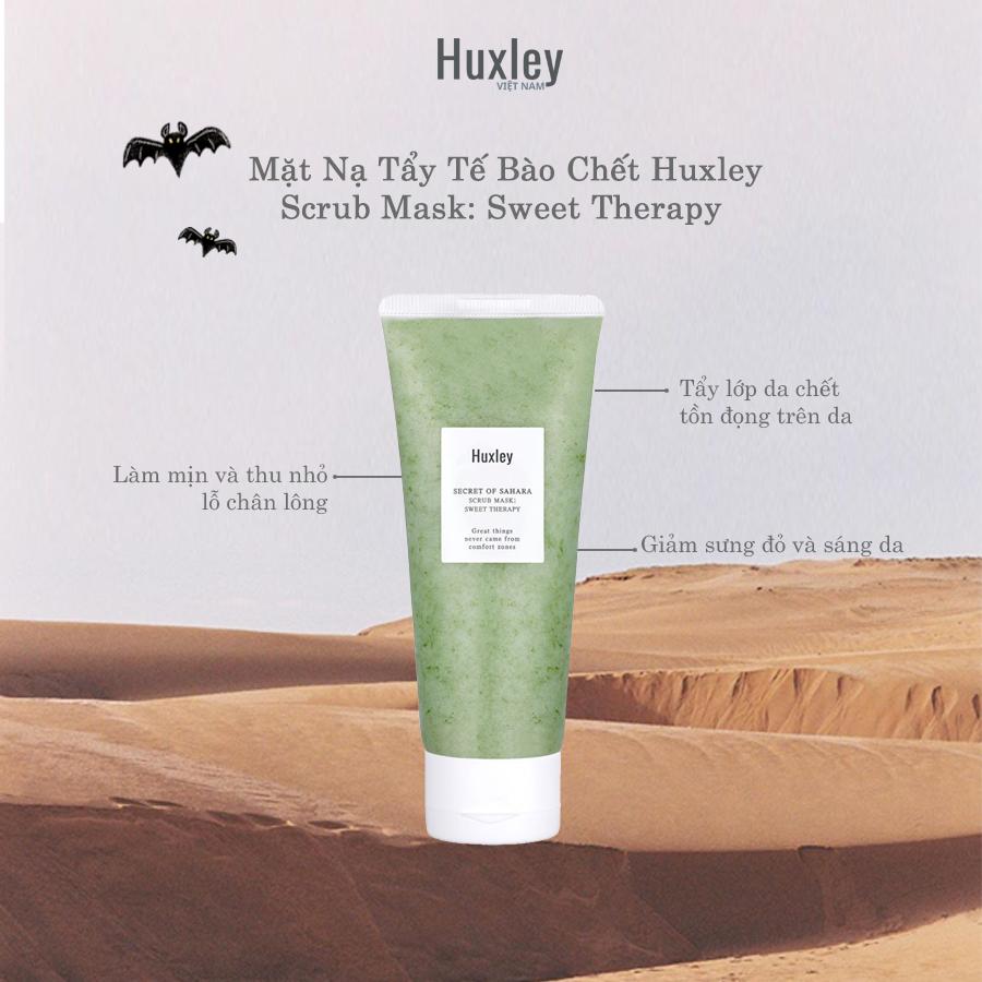 - Tẩy Da Chết Huxley Scrub Mask Sweet Therapy chứa tinh chất dầu và chiết xuất xương rồng có hàm lượng cao các vitamin, axit amin và khoáng chất giúp dưỡng ẩm tuyệt vời cho làn da, se khít lỗ chân lông, tăng cường hàng rào độ ẩm bảo vệ da, ngăn chặn độc tố, kháng viêm, kích thích tăng sinh collagen, chống lão hóa hiệu quả cho làn da.
