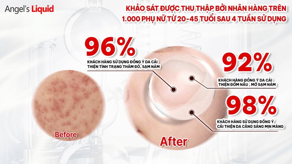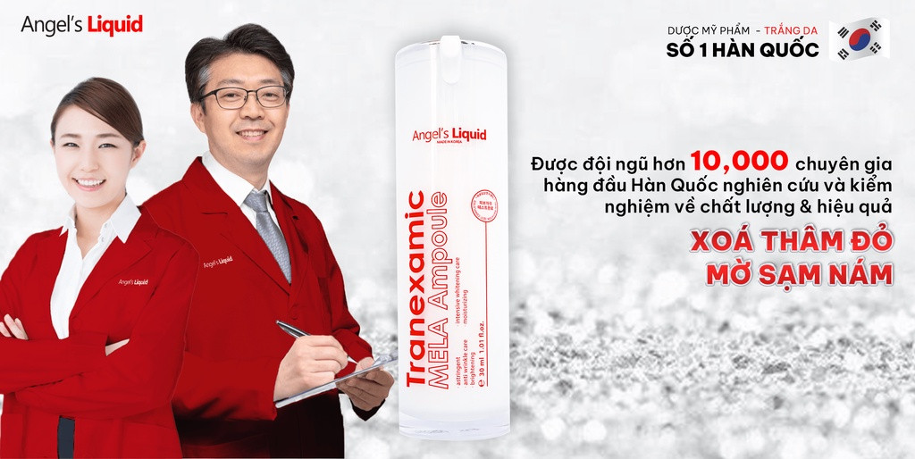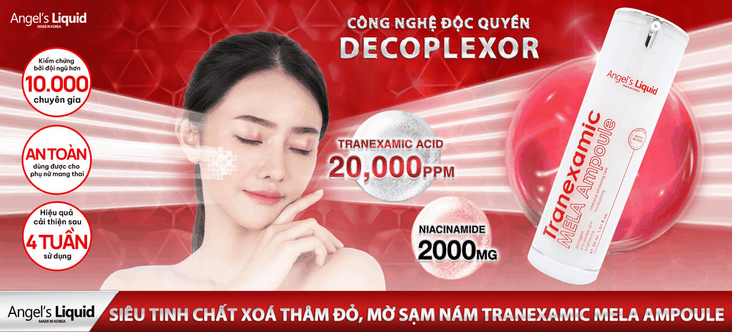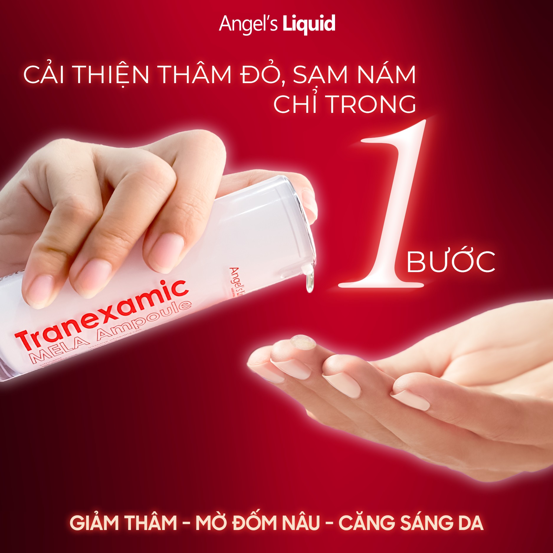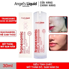 - Siêu Tinh Chất Xoá Thâm Đỏ, Mờ Sạm Nám Angel's Liquid Tranexamic Mela Ampoule 30ml chứa thành phần Tranexamic Acid 20,000ppm là hoạt chất được bác sĩ da liễu công nhận khả năng mờ thâm nám, điều trị vấn đề tăng sắc tố da do tiếp xúc trực tiếp với tia UV, ngoài ra còn giúp dưỡng sáng, làm đều màu da, làm mờ vết thâm sau mụn, giảm mẩn đỏ rõ rệt, làm mờ dần các vết nám xảy ra trong thời kỳ mang thai, chống viêm, kháng viêm và chống dị ứng, kích ứng cho da, bảo vệ và xoa dịu làn da bị tổn thương bởi các yếu tố gây hại từ môi trường như vi khuẩn bụi bẩn, nấm, phục hồi tổn thương da do tia UV có trong ánh nắng mặt trời gây ra.