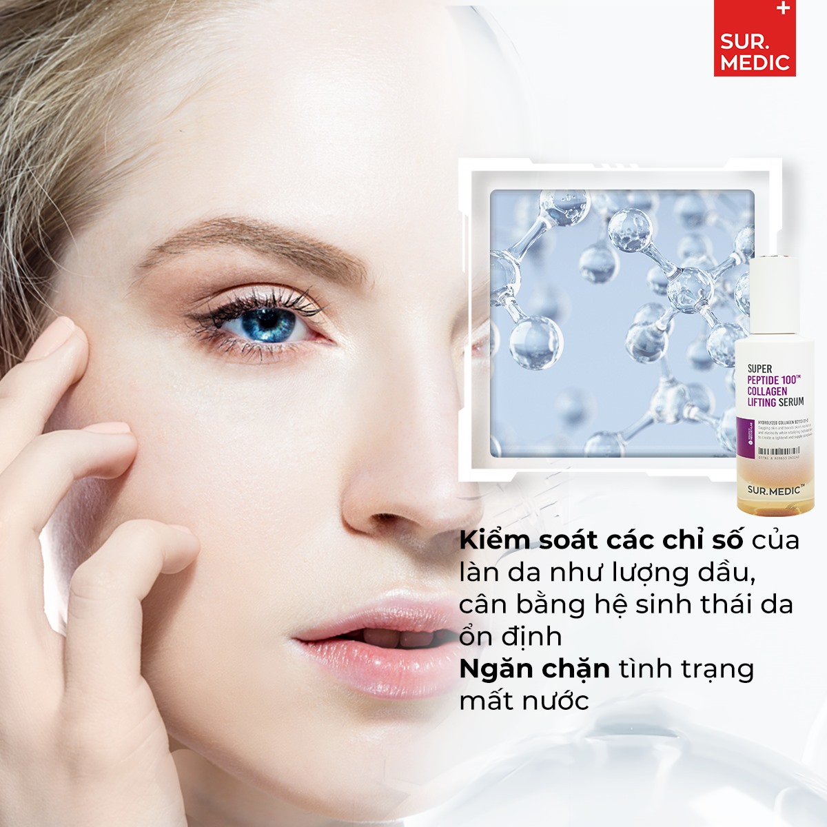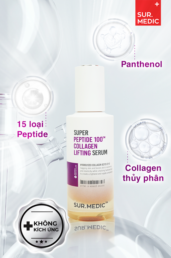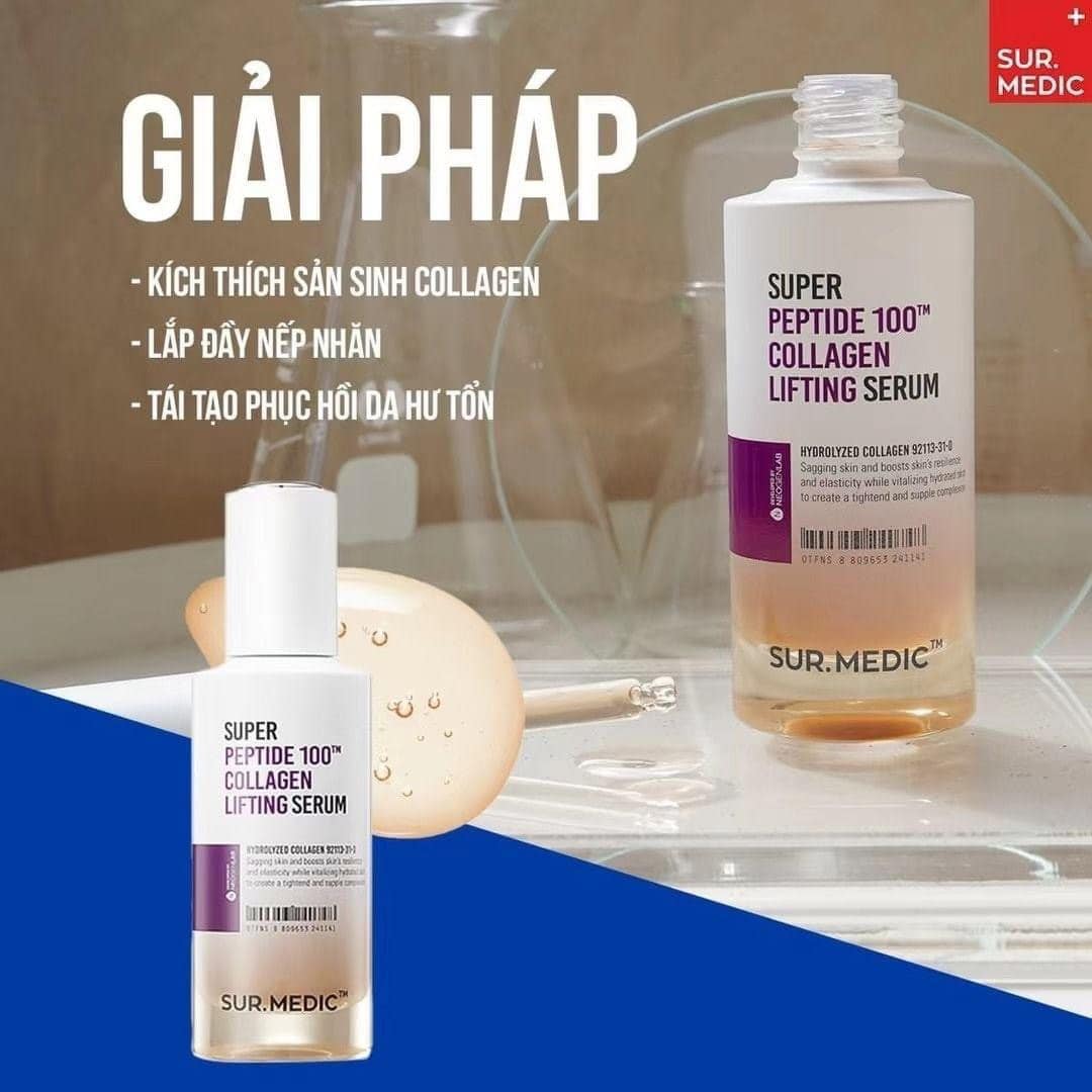 Tinh Chất Sur.Medic+ Làm Săn Chắc & Ngăn Lão Hóa Super Peptide 100™ Collagen Lifting Serum 50ml là dòng tinh chất đến từ thương hiệu mỹ phẩm Sur.Medic+ của Hàn Quốc, với thành phần chứa Collagen tổng hợp và 10 loại Peptide duy trì độ đàn hồi và độ ẩm của da mang lại làn da ẩm mịn, tăng cường hàng rào bảo vệ da, làm chậm quá trình lão hóa và hạn chế nếp nhăn xuất hiện.