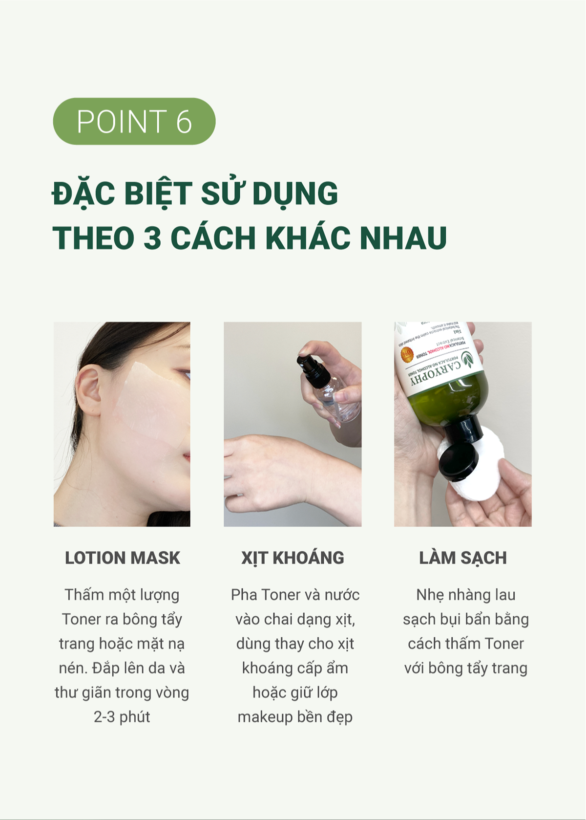 - Có thể sử dụng sản phẩm một cách đa năng như thay thế xịt khoáng, làm lotion mask và pha với nước làm nước rửa mặt.