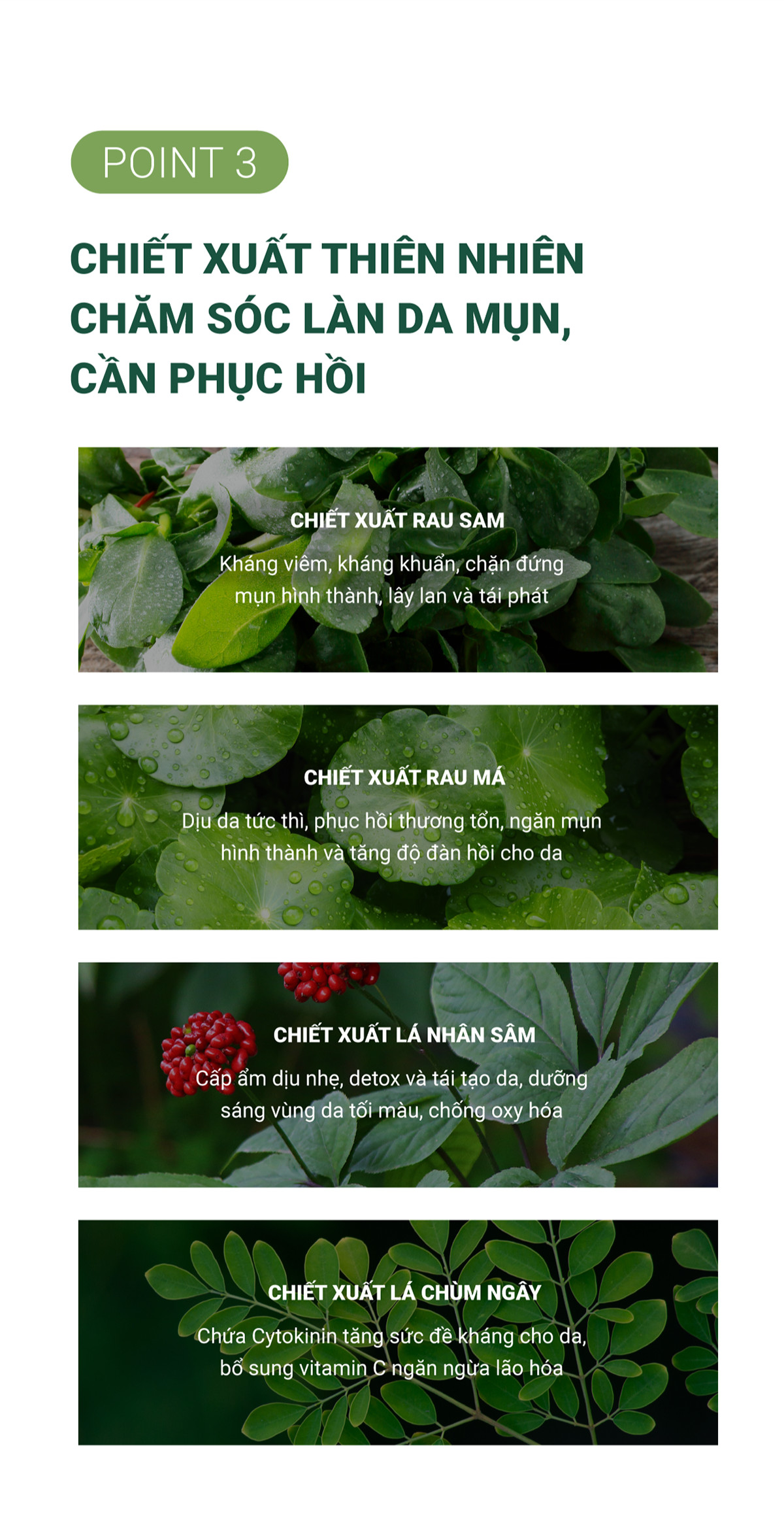 - Chiết xuất rau má có đặc tính ngăn ngừa các gốc tự do gây hại cho da, kháng khuẩn, kháng viêm, hydrat hóa lớp sừng. Cùng với hoạt chất Madecassoside giúp giảm viêm và làm lành da, kích thích sản xuất collagen làm săn chắc da và giảm sự xuất hiện của các nếp nhăn.