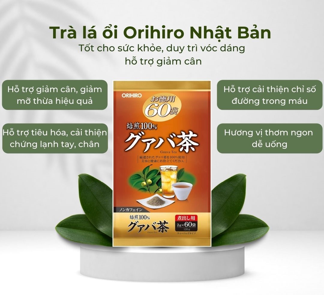 - Trà ổi hỗ trợ giảm cân Orihiro được chiết xuất từ 100% lá ổi tự nhiên chứa polyphenol, carotenoid, flavonoid, tannin, acid psiditanic có khả năng ngăn chặn sự chuyển hóa tinh bột thành đường. Nhờ thế, khi uống trà ổi thường xuyên sẽ hỗ trợ rất tốt cho việc giảm cân, giảm mỡ thừa.