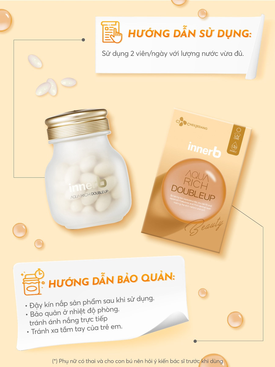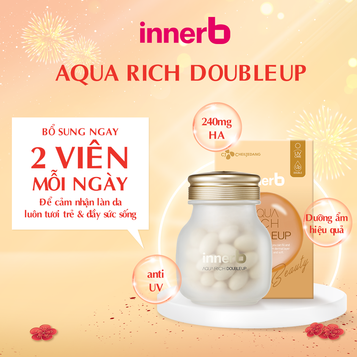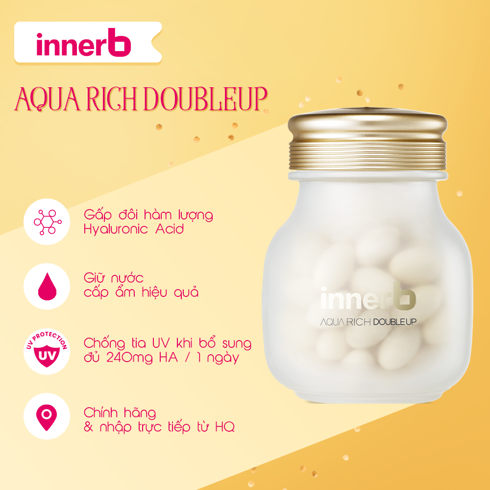 Viên Uống Cấp Nước, Bổ Sung Collagen, Bảo Vệ Da Khỏi Tia UV Innerb Aqua Rich DoubleUp là thực phẩm chức năng của thương hiệu Innerb (thuộc tập đoàn CJ) đến từ Hàn Quốc với hàm lượng HA 240mg gấp đôi phiên bản cũ ngoài việc tăng cường độ ẩm, giữ cho da luôn ngậm nước mà còn kích thích chữa lành vết thương và ngăn chặn các tế bào bị tổn thương do tia UV gây ra. Chứa Collagen giúp tăng độ đàn hồi và chống lão hóa mạnh cho da cùng với Glucosylceramide giúp làm sáng da đồng thời còn tạo lớp rào chắn giữ độ ẩm cho da.giữ cho da luôn ngậm nước.