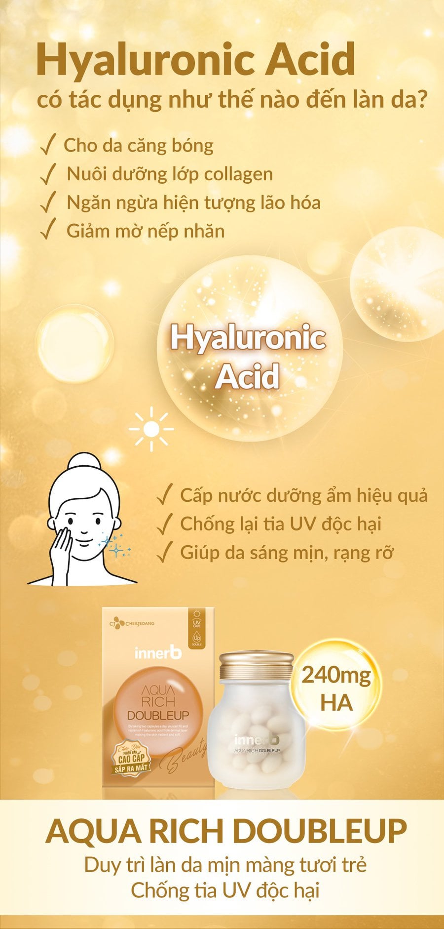 - Viên Uống Cấp Nước, Bổ Sung Collagen, Bảo Vệ Da Khỏi Tia UV Innerb Aqua Rich DoubleUp với thành phần chính là Hyaluronic Acid (HA) 240mg tồn tại dưới dạng Sodium Hyaluronate được tách ra từ HA với kích thước nhỏ hơn có khả giữ nước gấp 600 lần trọng lượng của mình tương đương 1gr HA có khả nắng ngậm đến 6 lít nước từ đó đó duy trì được độ ẩm và tạo lớp màng dưỡng ẩm bảo vệ độ ẩm cho da, làm chất đệm, lấp đầy và đẩy lùi các nếp nhăn. Viên uống Hyaluronic Acid còn là chất bôi trơn cho những mấu nối xương khớp, giữa những dây thần kinh, dưỡng ẩm cho da, tóc.