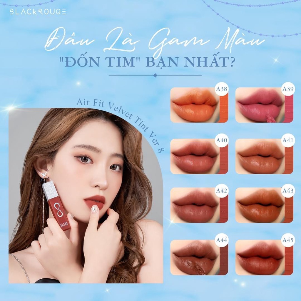 Dù không phải là bộ sưu tập đầu đời của Black Rouge nhưng Air Fit Velvet Tint lại là bộ sưu tập thành công nhất của thương hiệu, không ít phen làm mưa làm gió trên thị trường. Bộ sưu tập Air Fit Velvet Tint có 8 phiên bản, mỗi phiên bản là một bản tình ca tuyệt đẹp, “đốn gục” hàng triệu trái tim phái đẹp nhờ sự tinh tế trong từng màu sắc.