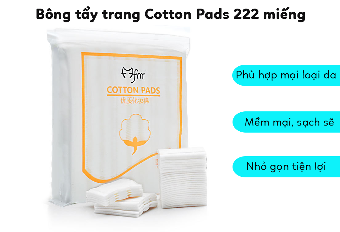 Bông tẩy trang Fm Cotton Pads 222 miếng đựng trong túi zip nhỏ mỏ và đóng khá tiện lợi chống bụi bẩn bông tẩy trang cotton pads là hàng nội địa Trung. Với gói 222 miếng dùng tẹt ga đến 2-3 tháng. Bông dai 100% bông có 3 lớp dễ sử dụng có kích thước vừa phải có viền ép khá chắc chắn, nên khi sử dụng sẽ không sợ bị xù lông hay xơ, không để lại nhưng vết bông gây khó chịu.
