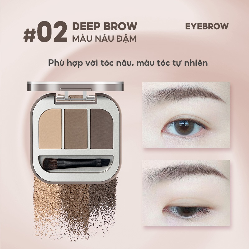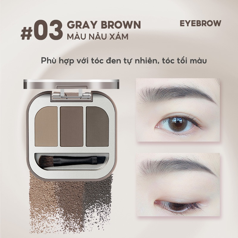 - Chứa 3 ô màu: Nâu nhạt, Nâu trung và Nâu đậm, giúp bạn dễ dàng phối hợp và tạo ra đôi lông mày hoàn hảo.