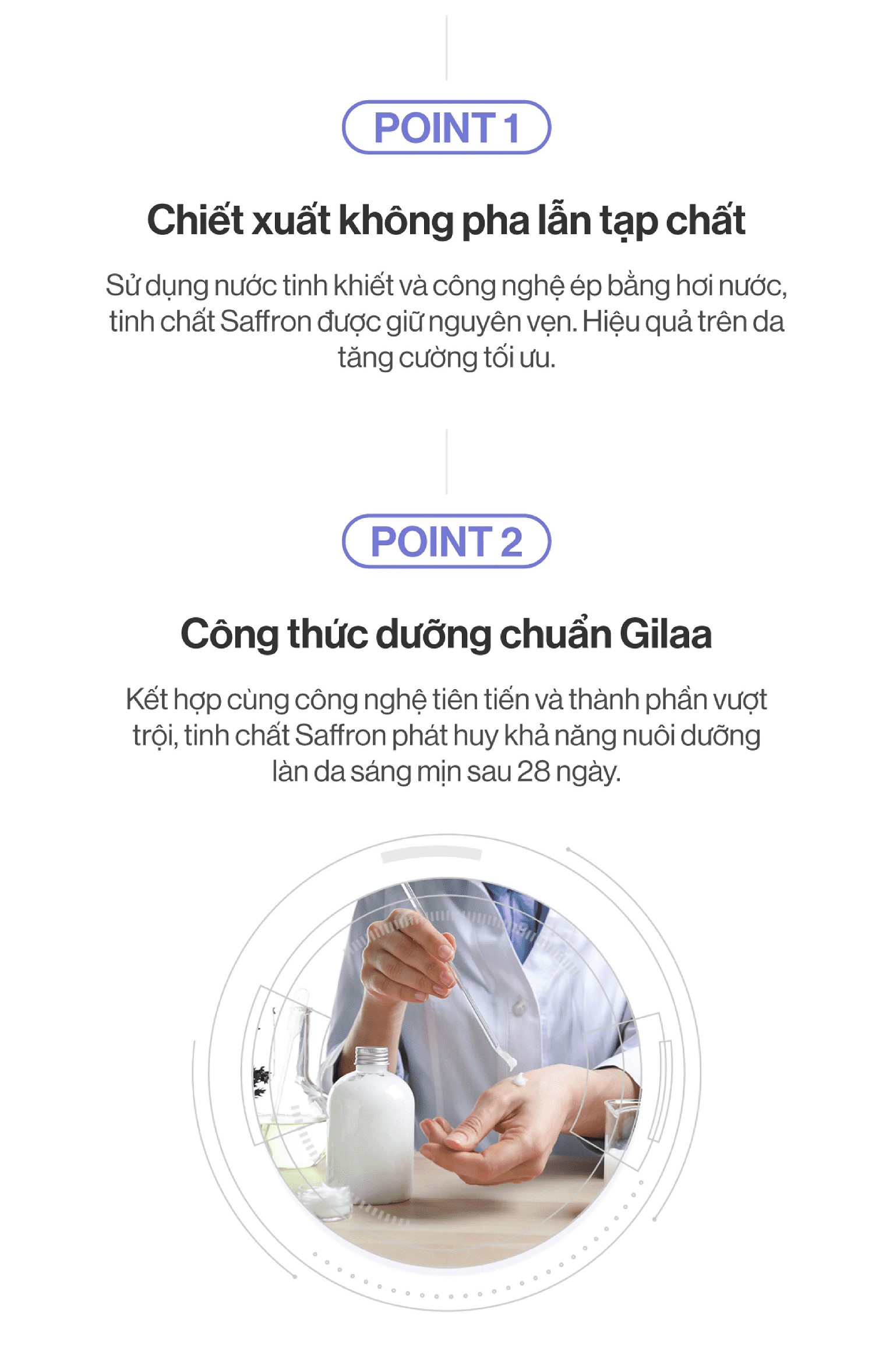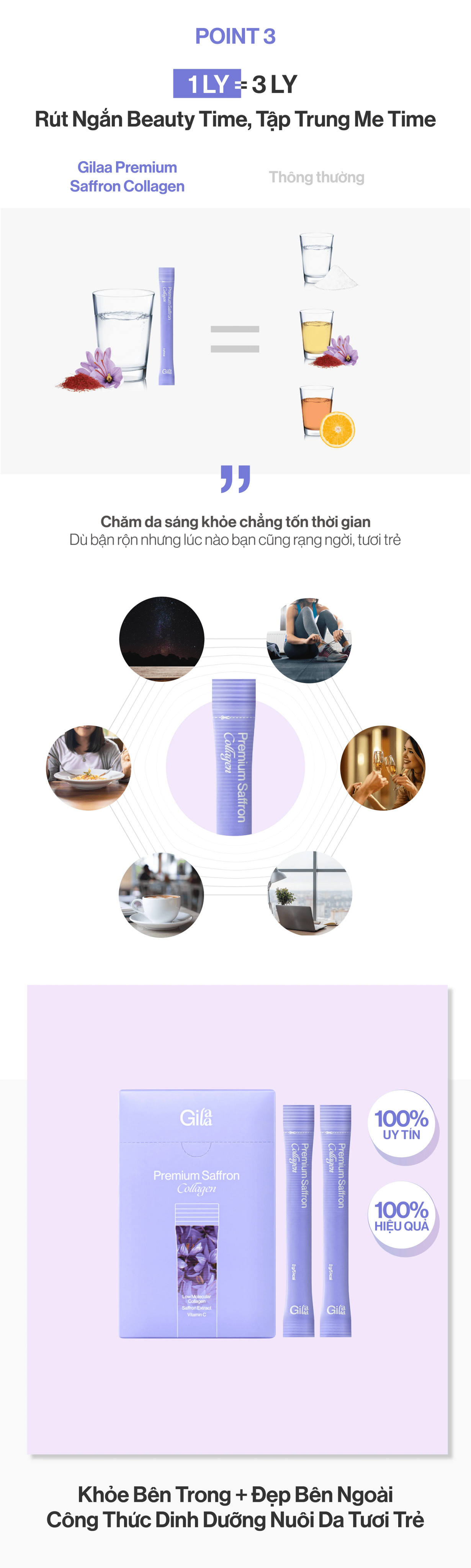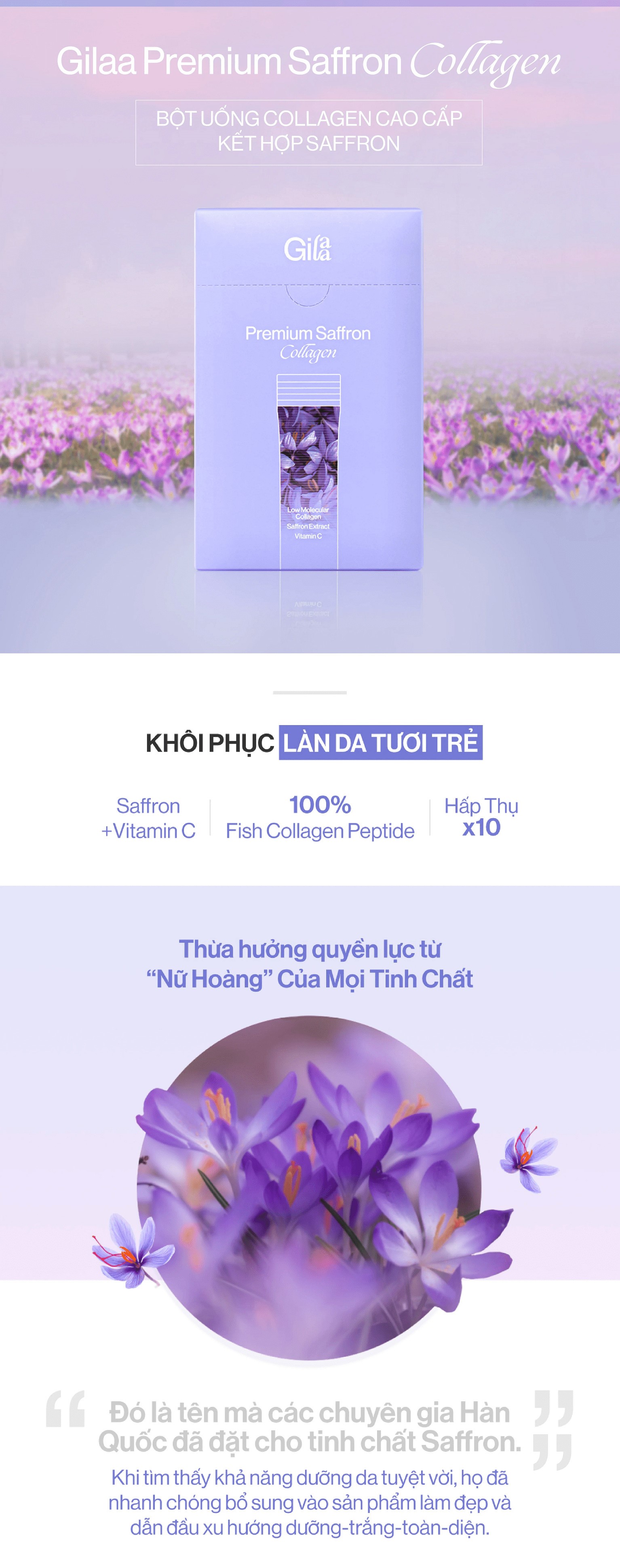 - Bột Uống Gilaa Premium Saffron Collagen với thành phần chính chứa nhụy hoa nghệ tây có chứa Carotenoid, Retinol cùng các hoạt chất chống oxy hóa, giúp ức chế hoạt động của Enzyme Tyrosinase – thủ phạm tạo nên Melanin khiến da sạm màu. Đặc biệt được quan tâm nhất là thành phần Crocin có tác dụng chống lão hóa tuyệt vời, ngăn ngừa tác hại của tia UV, làm trắng, giảm nám, hạn chế mụn, phục hồi thương tổn trên da do mụn. Ngoài ra nhụy hoa nghệ tây còn giàu Vitamin (đặc biệt B1 và B2), các Amino Acid, Khoáng Chất...mang đến nhiều lợi ích cho da.