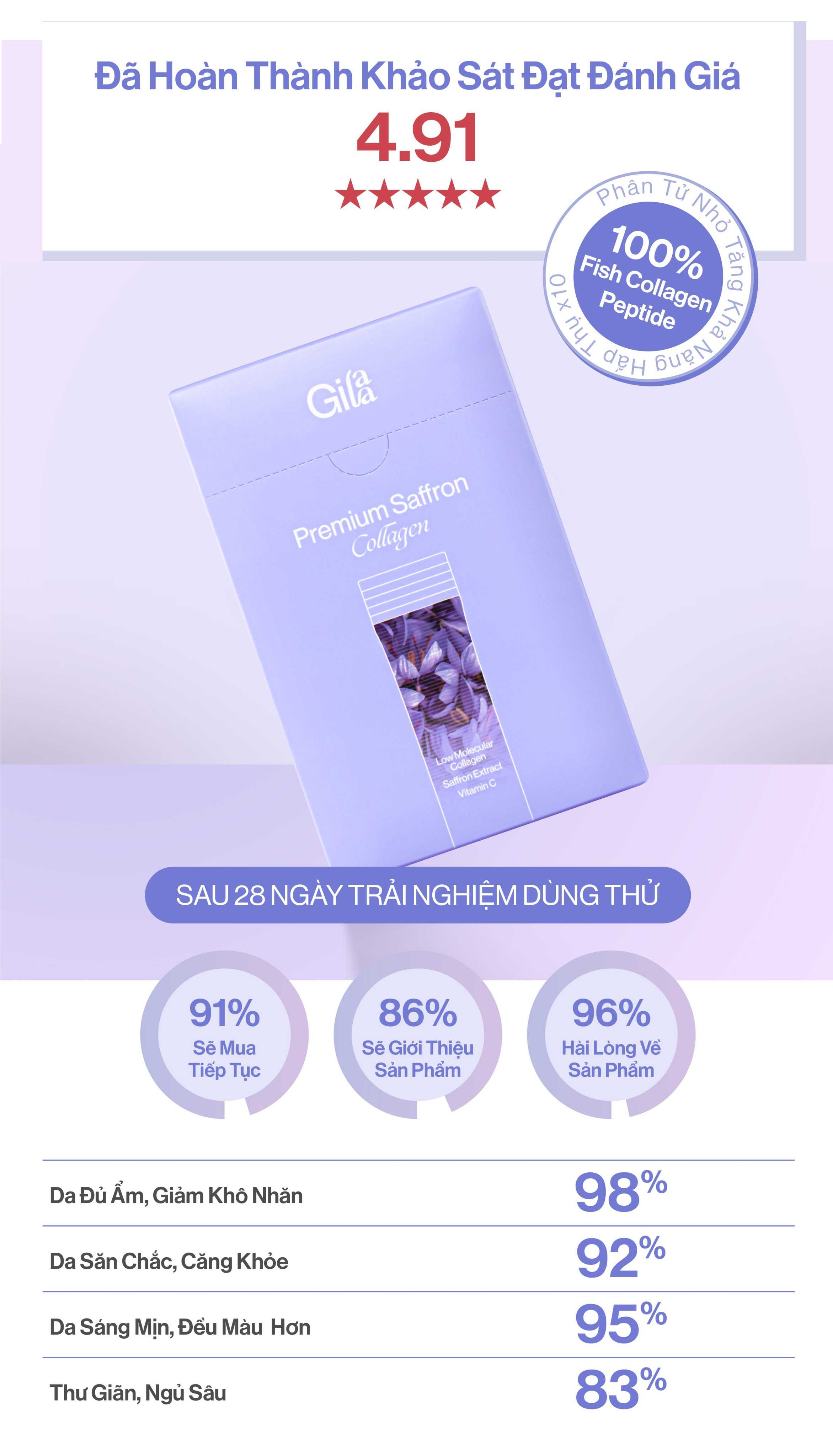 Bột Uống Collagen Gilaa Cao Cấp Kết Hợp Saffron 2g x 60 Gói là dòng thực uống hỗ trợ làm đẹp đến từ thương hiệu mỹ phẩm Gilaa của Hàn Quốc, với sự kết hợp ưu việt từ 500mg collagen peptide từ cá Italia, 120mg saffaron và 8 loại vitamin thiết yếu giúp nuôi dưỡng cơ thể và làn da từ sâu bên trong, cải thiện các dấu hiệu lão hoá, sạm nám đem đến làn da sáng mịn, đàn hồi, săn chắc.
