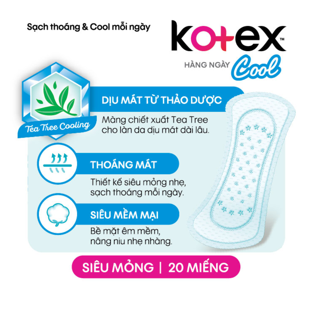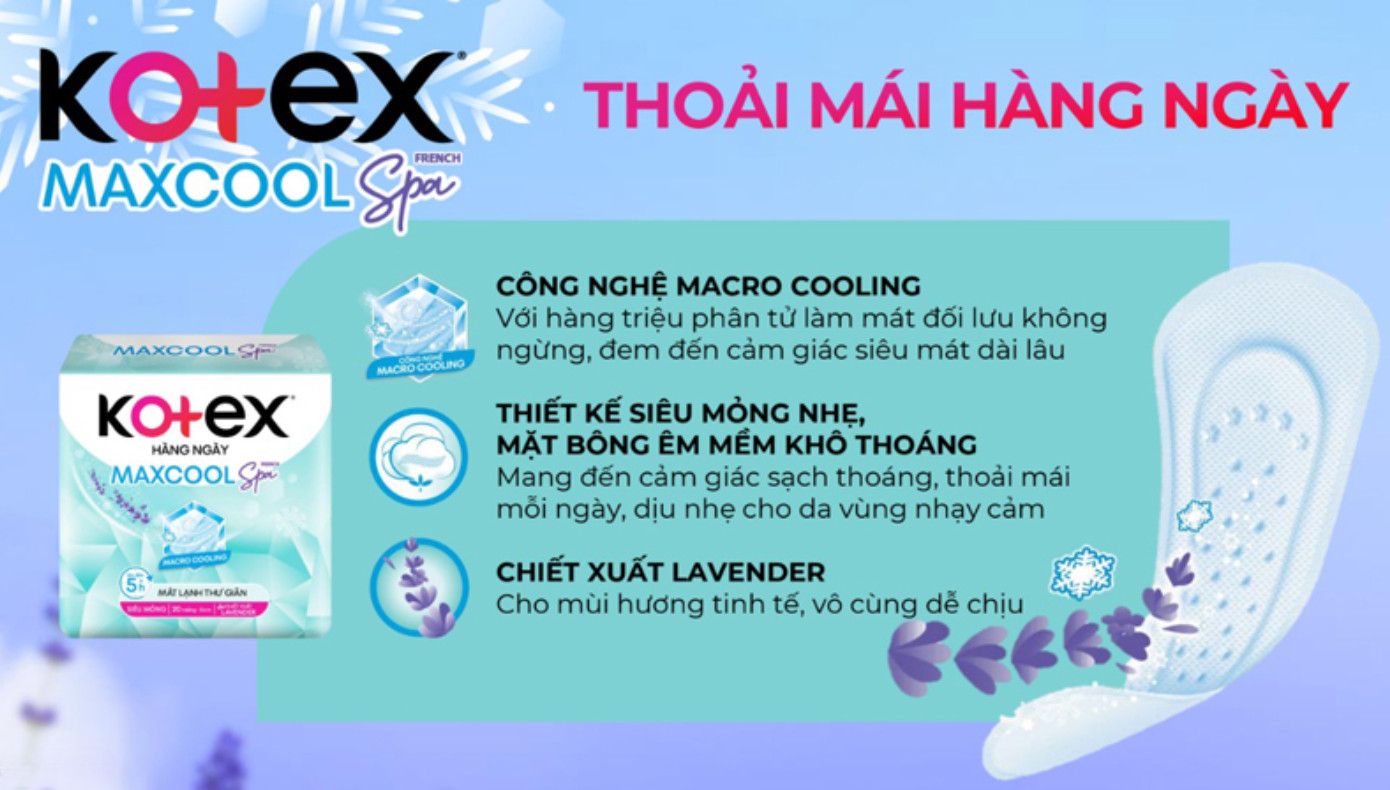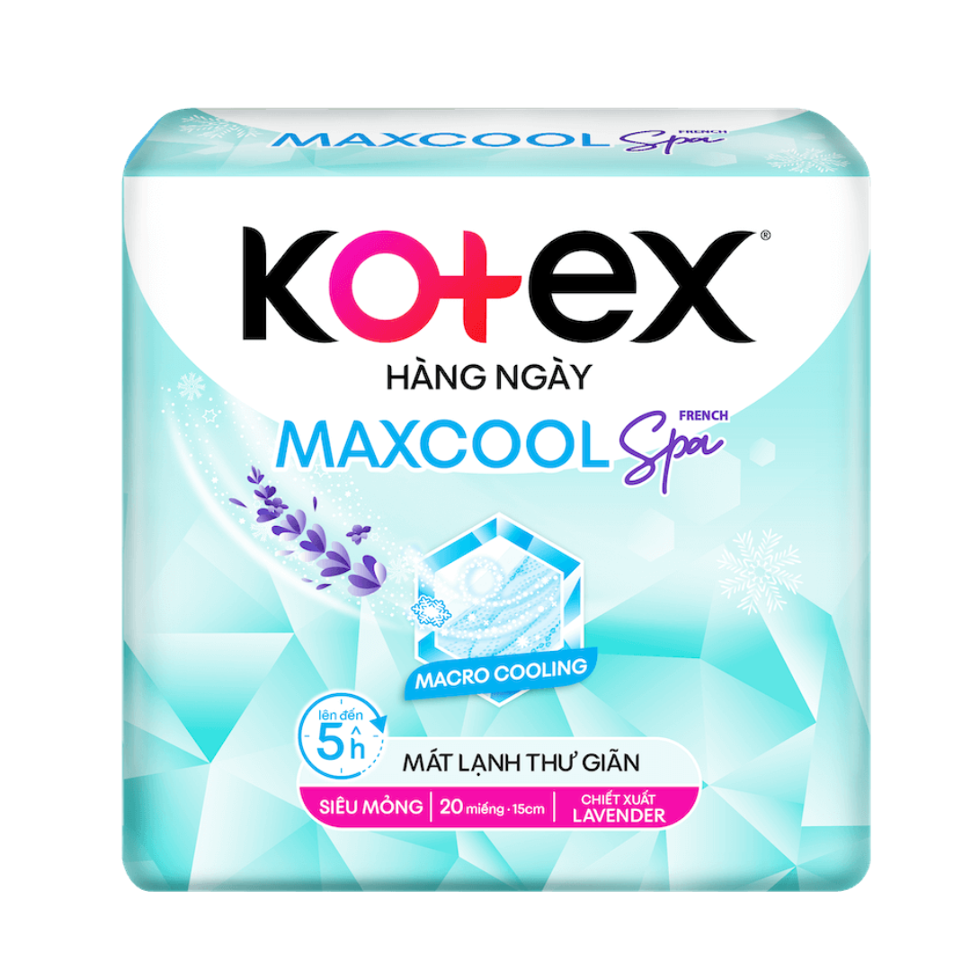 Băng vệ sinh mát lạnh là một trong những dòng sản phẩm được nhiều bạn gái yêu thích bởi cảm giác dịu mát, dễ chịu, “đánh bay” nỗi khó chịu trong ngày đèn đỏ. Đặc biệt, Kotex Hàng Ngày Max Cool là một trong những dòng sản phẩm băng vệ sinh hàng ngày bán chạy hàng đầu của thương hiệu Kotex với khả năng duy trì cảm giác mát lạnh lên đến 4 tiếng. Tiếp nối sự thành công của Max Cool, Kotex cho ra mắt dòng băng vệ sinh Kotex Max Cool French Spa - bản upgrade vượt trội về khả năng làm mát cùng mùi hương Lavender dịu êm đầy thư giãn. Cùng tìm hiểu chi tiết những điểm nổi bật của dòng sản phẩm Kotex Hàng Ngày Max Cool French Spa 20 miếng mới này nhé!