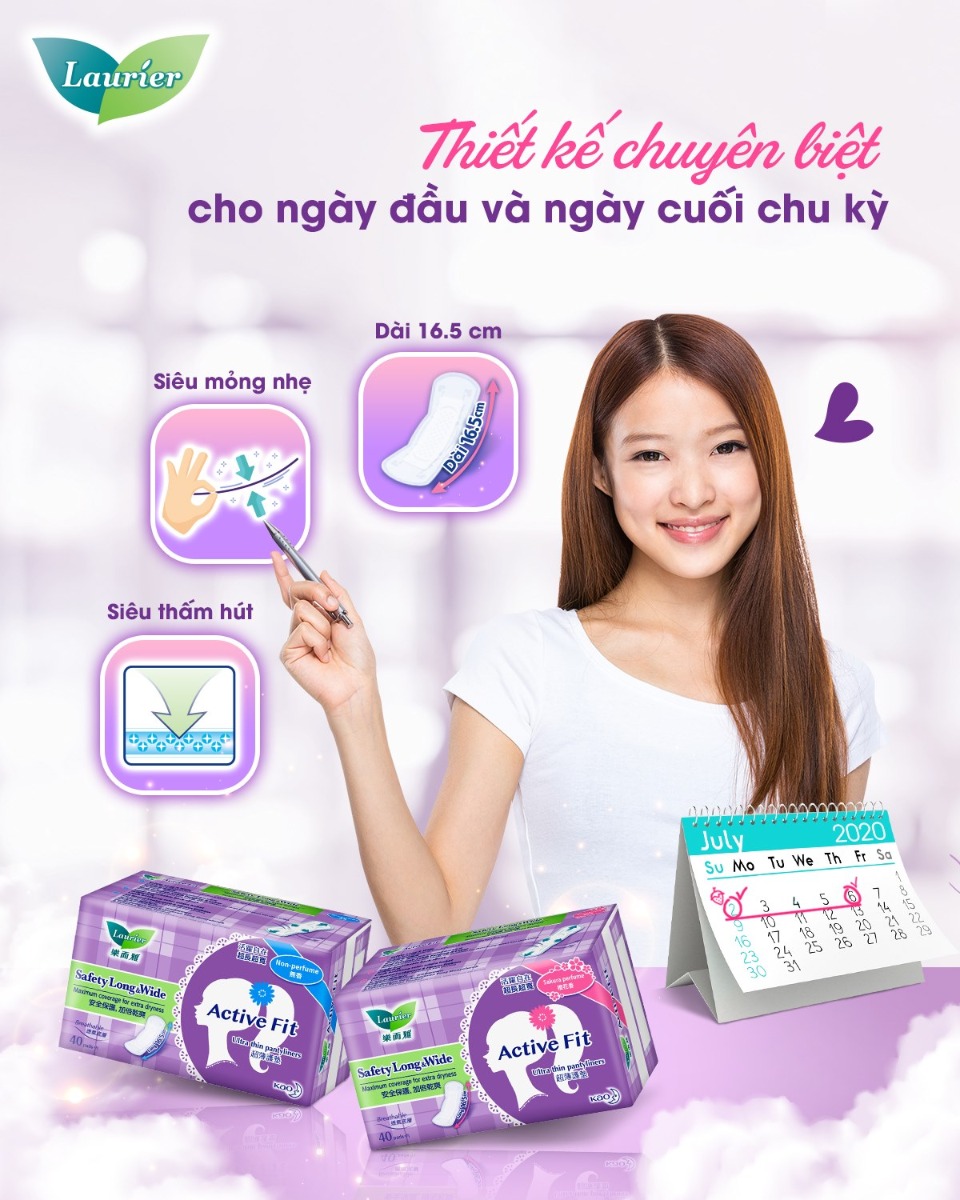 - Lauríer Active Fit Safety Long & Wide có thiết kế dài và rộng hơn, cùng với vòng chống tràn xung quanh giúp ngăn tràn tối ưu trong những ngày đầu hay cuối của chu kỳ hoặc những ngày huyết trắng nhiều.