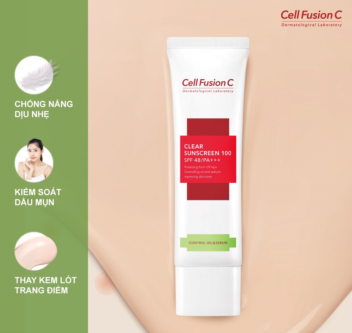 Kem Chống Nắng Cell Fusion C Clear Sunscreen 100 SPF48/PA+++ là kem chống nắng dành cho làn da dầu, da bị mụn, da vừa qua xâm lấn, da yếu và dễ tổn thương nhất thuộc thương hiệu dược mỹ phẩm Céll Fùsion C đến từ Hàn Quốc.