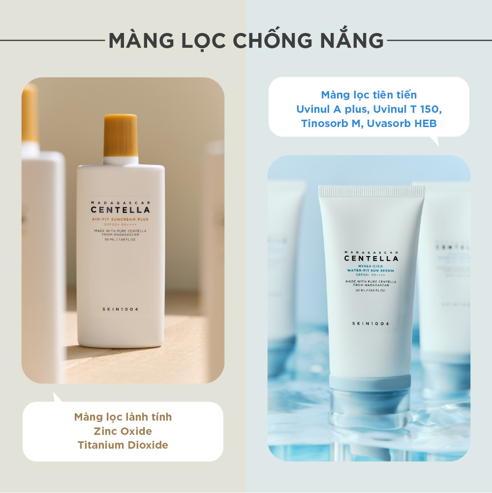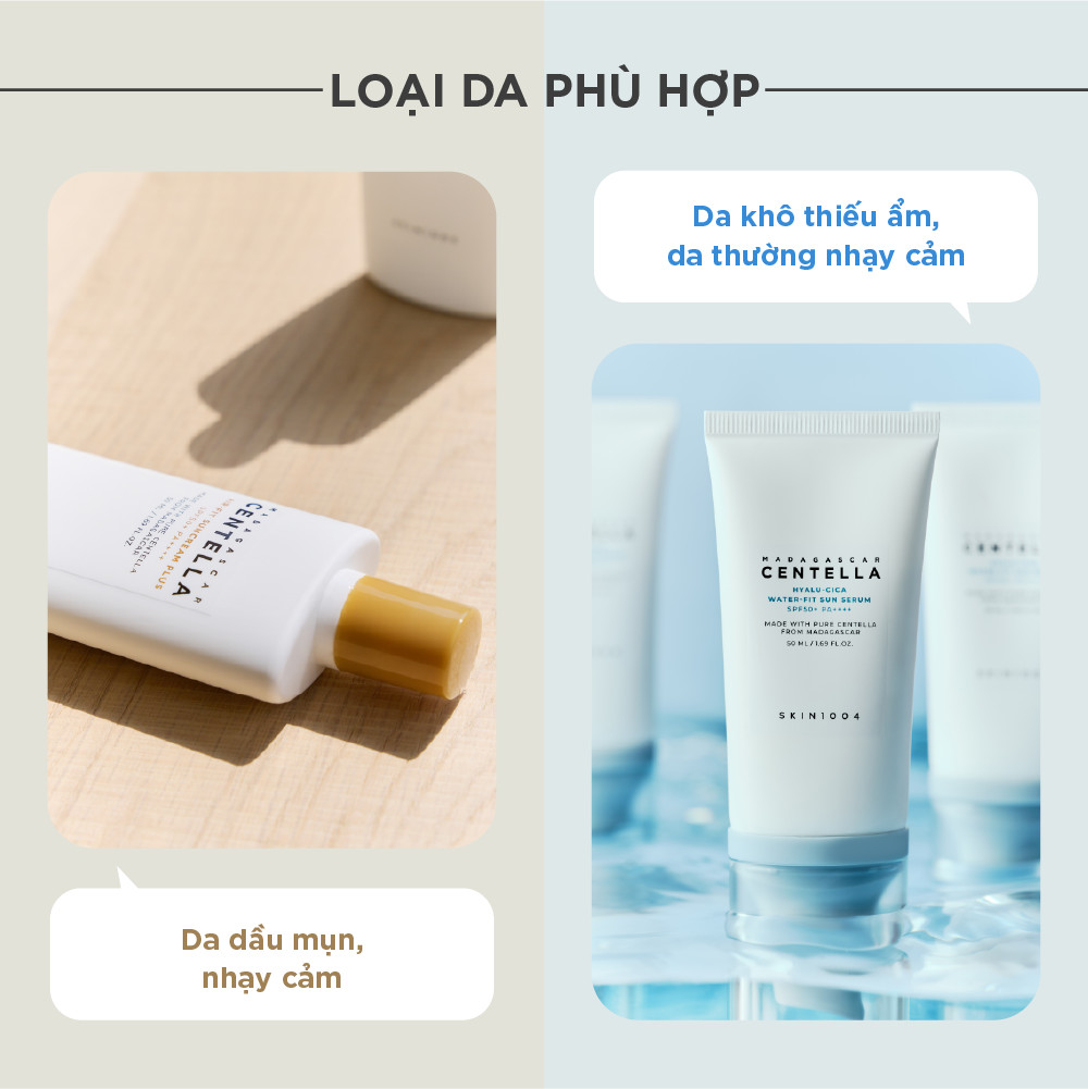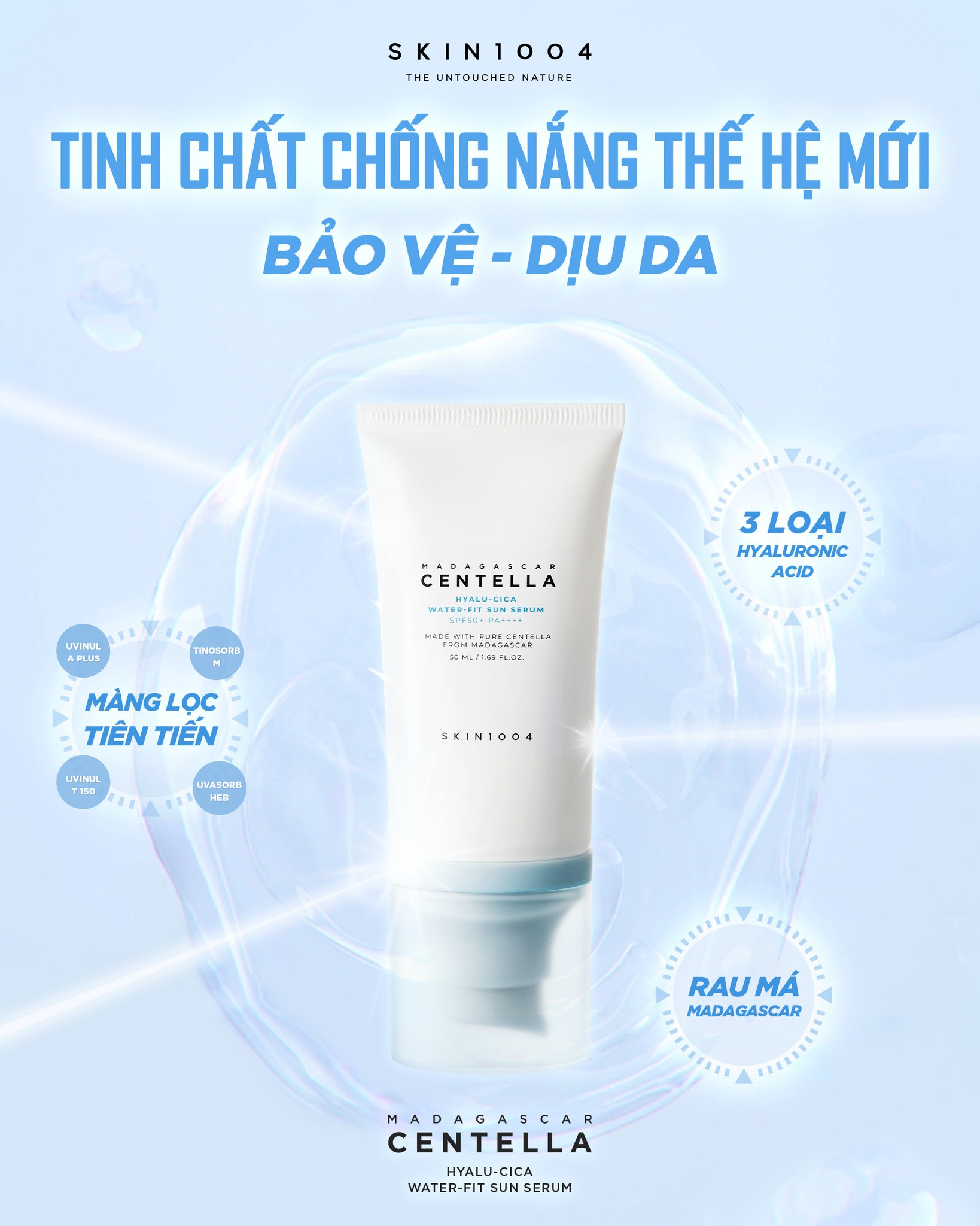 - Tinh Chất Chống Nắng Skin1004 Madagascar Centella Hyalu-Cica Water Fit Sun Serum SPF50+ PA++++ là kem chống nắng hóa học với chỉ số chống nắng cao, công thức với màng lọc chống nắng tối ưu giúp bảo vệ da trước các tác hại từ tia UV. Đồng thời thành phần nổi bật với chiết xuất Rau má, HA, phức hợp 7 loại rau mầm giúp làm dịu da nhạy cảm, bổ sung độ ẩm, tăng cường hàng rào bảo vệ da mang lại làn da săn chắc, ẩm mượt, căng mọng.