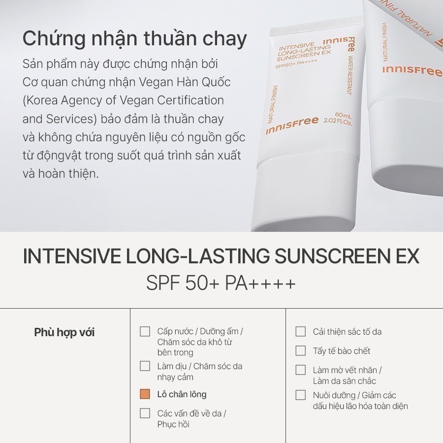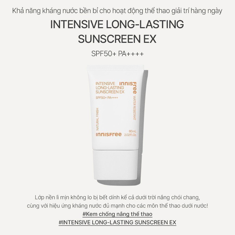 - Kem Chống Nắng Chống Trôi Innisfree Intensive Long-lasting Sunscreen là kem chống nắng có 3 tác động: Dưỡng trắng – Chống nhăn – Chống thấm nước. Sử dụng công nghệ đặc biệt giúp màng chống nắng chịu được ma sát dưới tác động rửa trôi của nước.