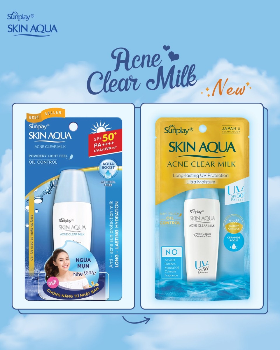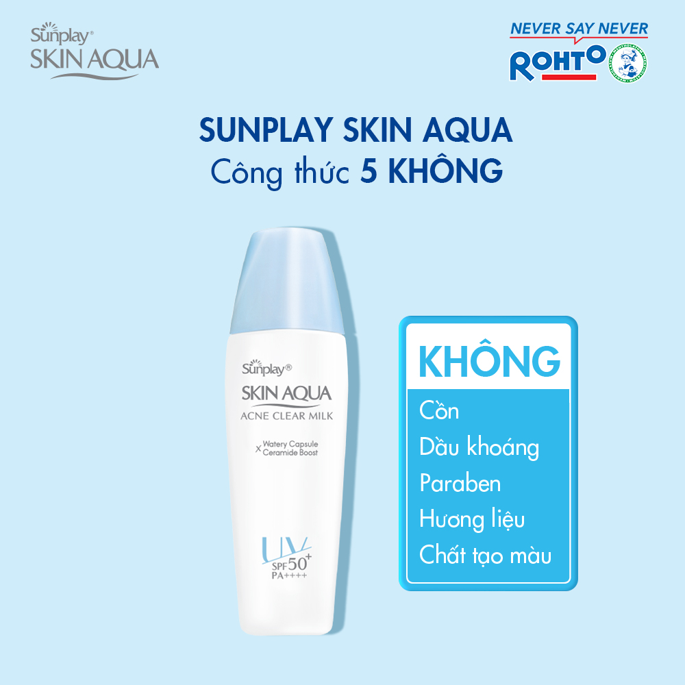 Sữa Chống Nắng Sunplay Skin Aqua Acne Clear Milk SPF50+ PA++++ là dòng sản phẩm chống nắng chuyên biệt cho làn da dầu và dễ nổi mụn đến từ thương hiệu chống nắng Sunplay Skin Aqua. Công thức cải tiến mới năm 2021 được ứng dụng công nghệ CHỐNG NẮNG - GIỮ ẨM đột phá từ Nhật Bản với chỉ số SPF50+ PA++++ giúp chống nắng mạnh mẽ và bền bỉ trên da, đồng thời hạn chế tình trạng mất nước và duy trì độ ẩm tối ưu. Kết cấu dạng sữa với các hạt phấn siêu mịn giúp hấp thu bã nhờn, kiểm soát dầu, giữ da luôn thoáng mịn và ngăn ngừa hình thành mụn.