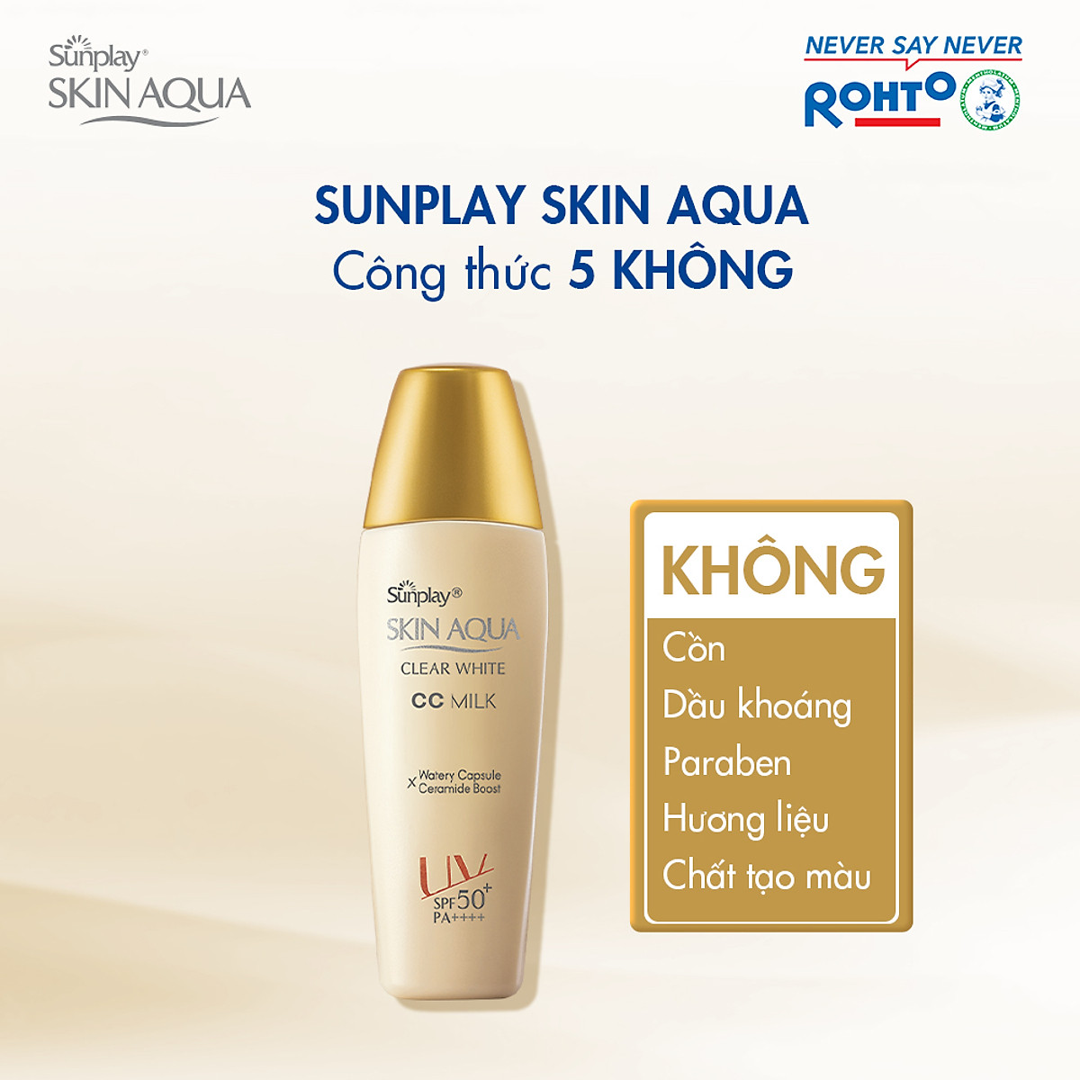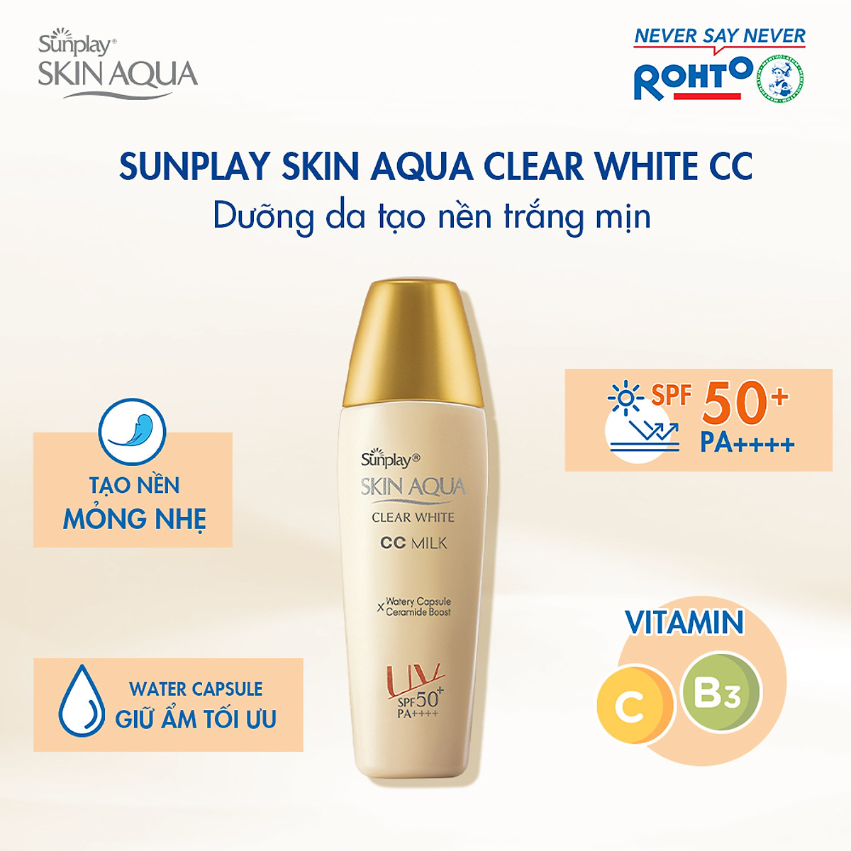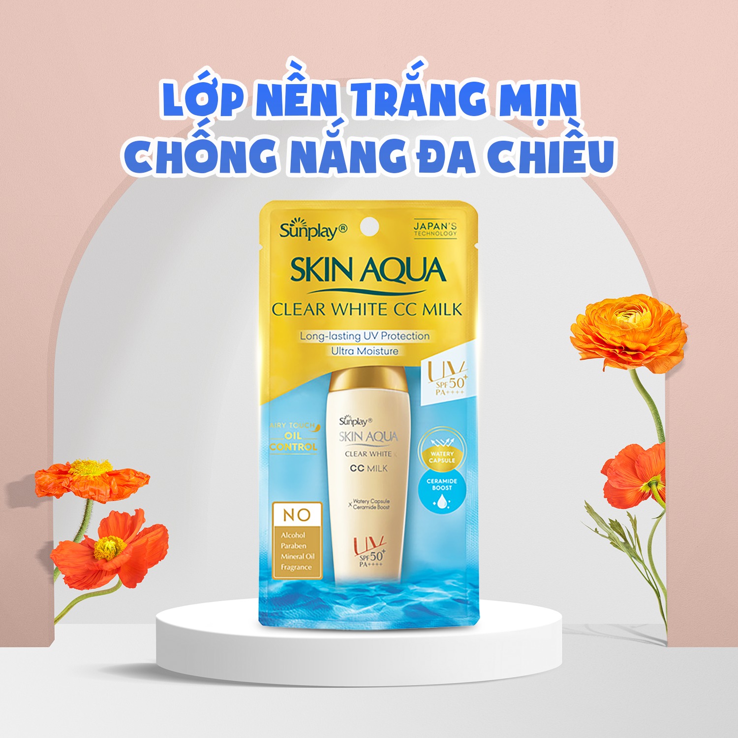 - Sunplay Skin Aqua Clear White CC Milk SPF50+/PA++++ có khả năng chống nước và chống trôi cao.