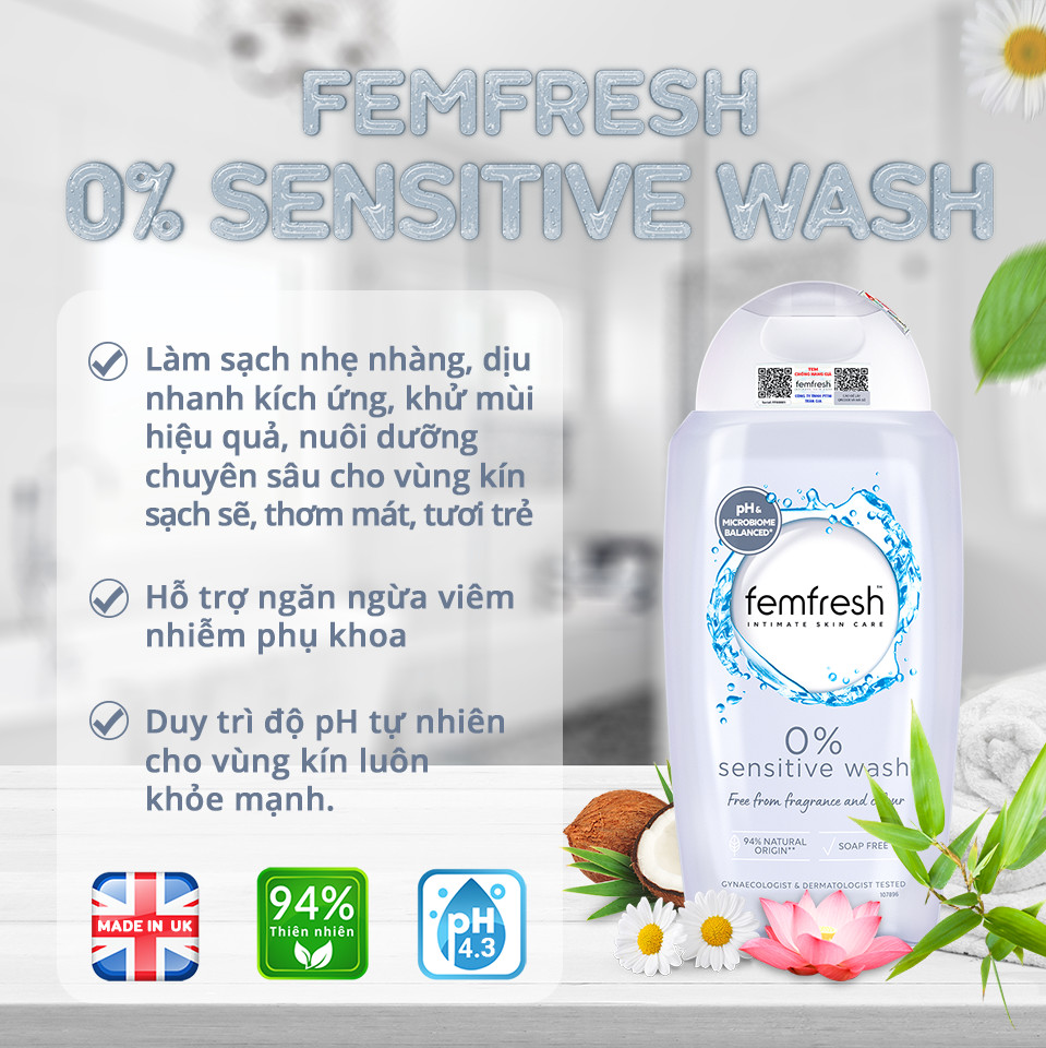 - Dung Dịch Vệ Sinh Phụ Nữ Dành Cho Da Nhạy Cảm Femfresh Sensitive Intimate Wash với chiết xuất hoa sen giúp hoạt động làm sạch vùng kín một cách nhẹ nhàng và hiệu quả.