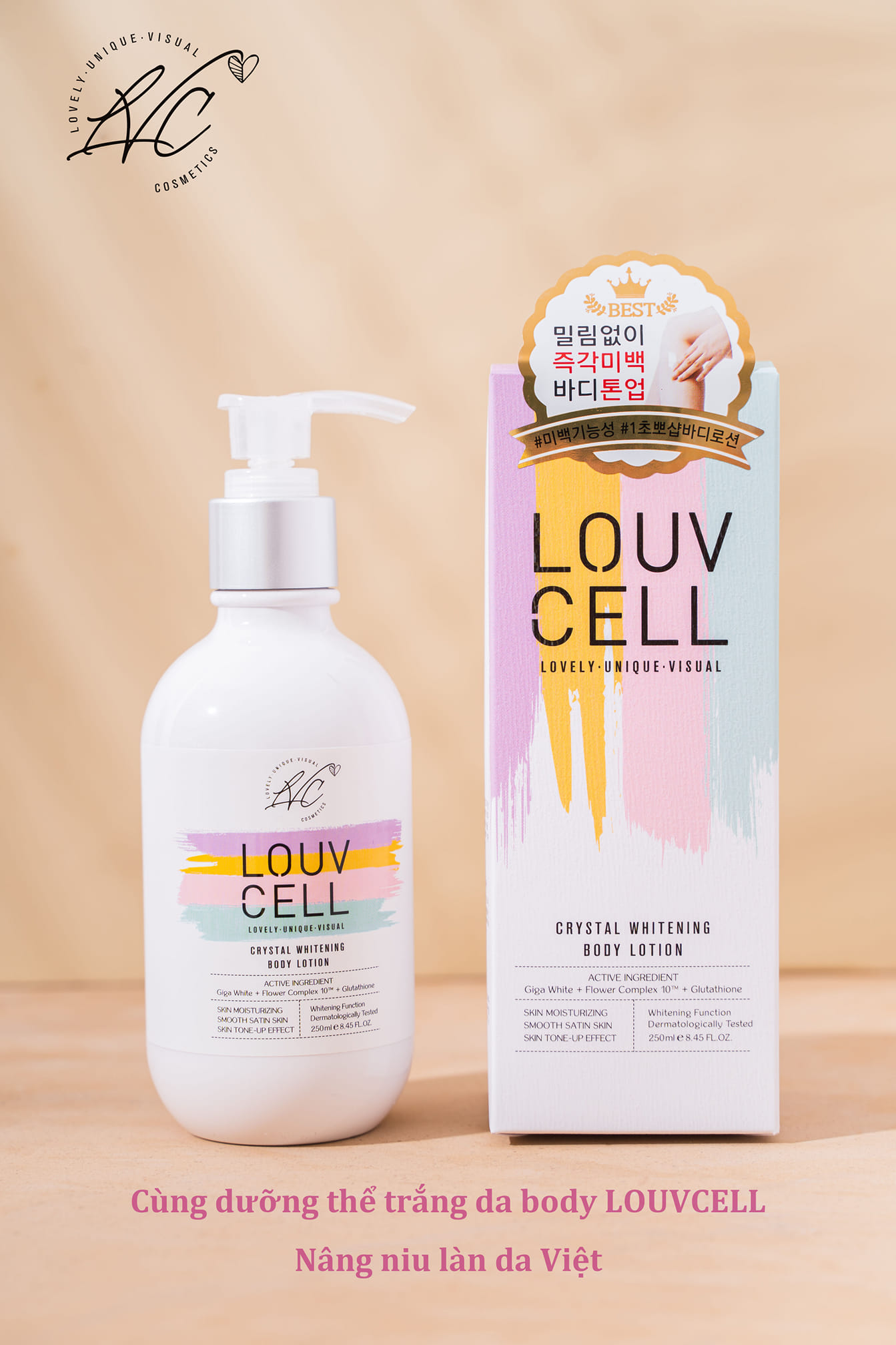 Sữa Dưỡng Thể Trắng Da, Nâng Tone LouvCell Crystal Whitening Body Lotion 250ml là dòng sản phẩm dưỡng thể nổi tiếng của thị trường mỹ phẩm Hàn Quốc. Với công thức độc đáo kết hợp của 10 loại quả glutathione và Gigawhite làm bật tông, mờ thâm nám, sửa chữa tế bào da cháy nắng mang đến cho chị em làn da trắng hồng, đều màu rạng rỡ.